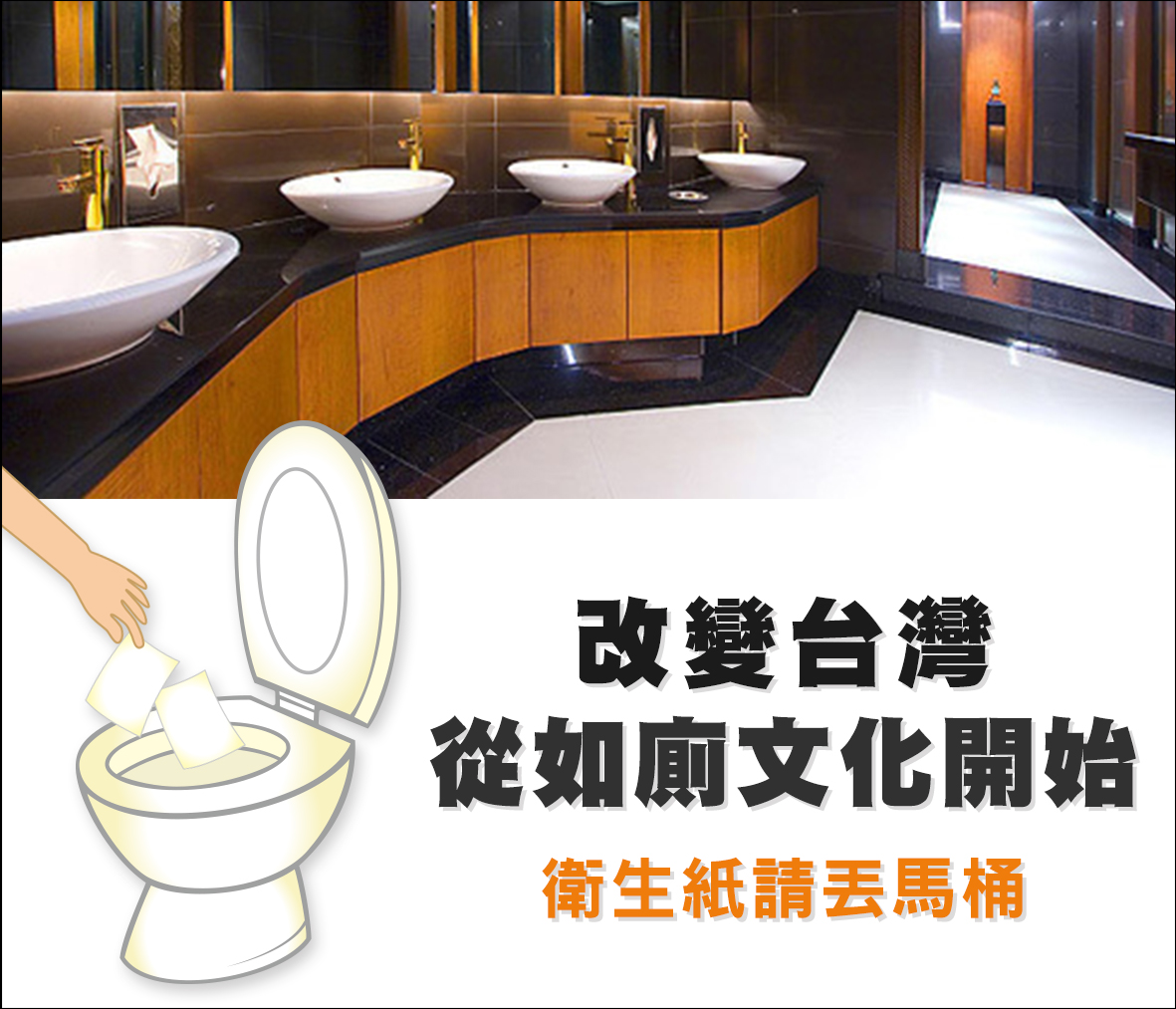 為擴大全國公廁品質達「特優級」目標,環保署規劃自106年下半年起推動「全國公廁改善計畫」,除將加強硬體設施的汰舊換新外,並宣導「衛生紙丟馬桶」政策,以期提升國民如廁文化。
