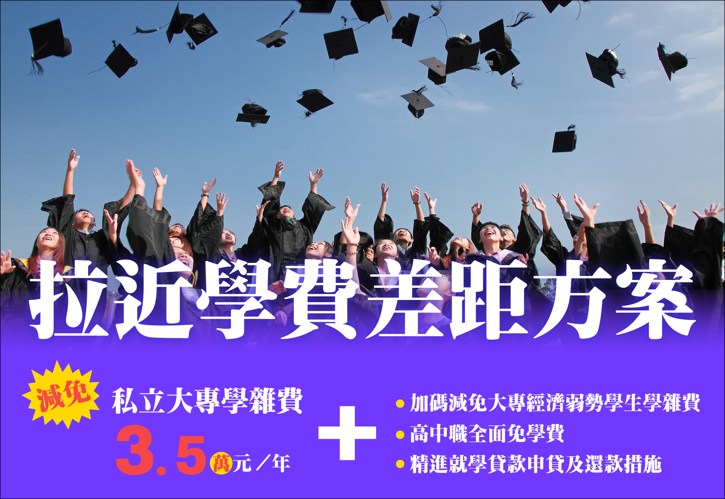 為朝「0到22歲國家一起栽培」的目標邁進,行政院再於112年6月29日通過總經費219億元的「拉近公私立學校學雜費差距及其配套措施方案」,自113年2月實施,落實教育平權,以「定額減免私立大專學雜費」為主軸,並搭配「對公私立大專經濟弱勢學生加碼補助」、「全面落實高中職免學費」,以及「精進就學貸款申貸及還款措施」等3項配套措施,讓每位孩子可不受限於經濟壓力,選擇喜愛的學校和科系,也讓公私立大專院校能發展特色科系,培育國家各行各業的人才。