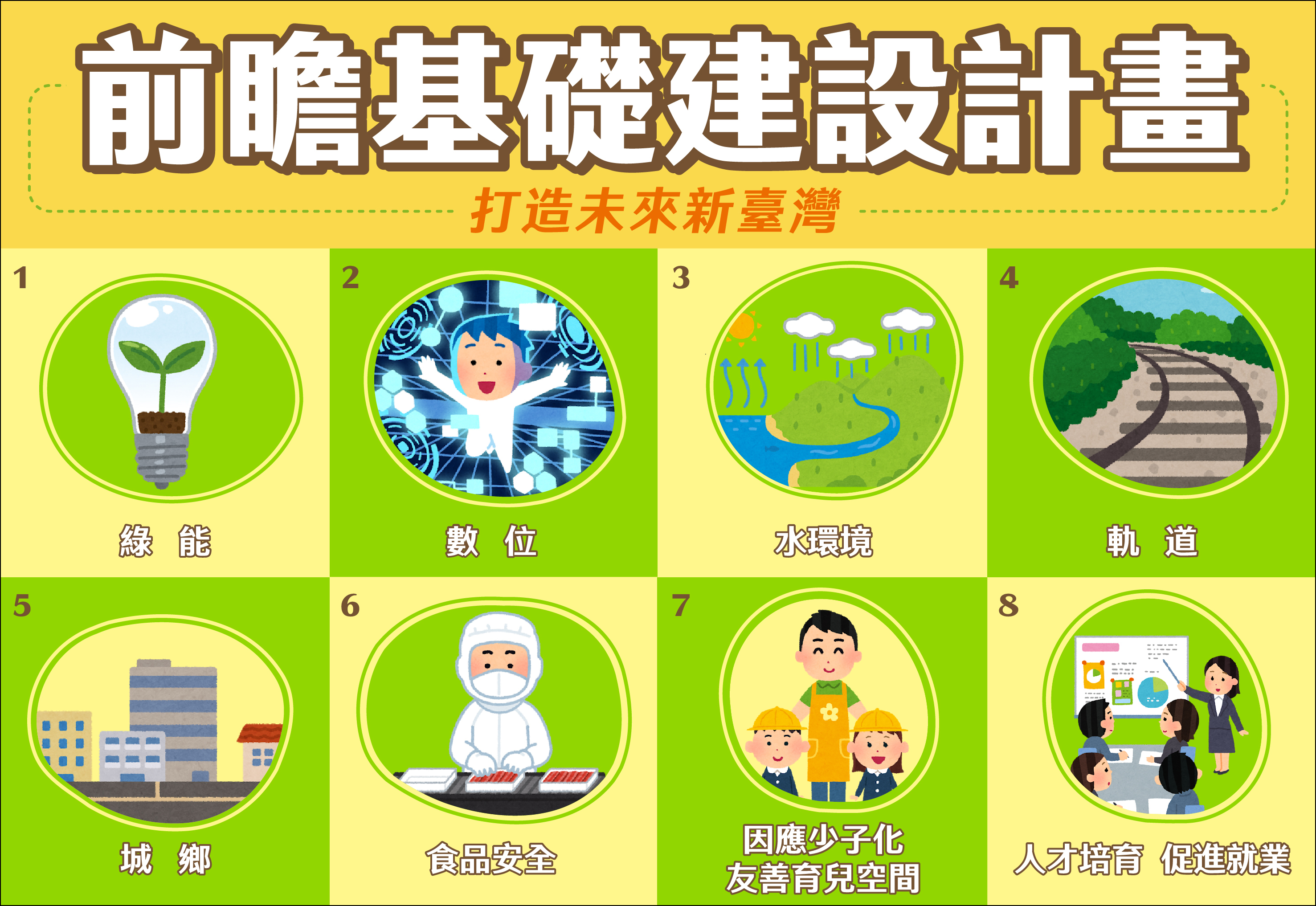 為振興經濟、帶動整體經濟動能,並因應國內外新產業、新技術及新生活趨勢,政府自106年起積極推動「前瞻基礎建設計畫」(下稱前瞻計畫),包含促進環境永續的「綠能建設」、營造智慧國土的「數位建設」、因應氣候變遷的「水環境建設」、建構安全便捷的「軌道建設」、加強區域均衡的「城鄉建設」、「因應少子化友善育兒空間建設」、「食品安全建設」和「人才培育促進就業建設」等8項建設。