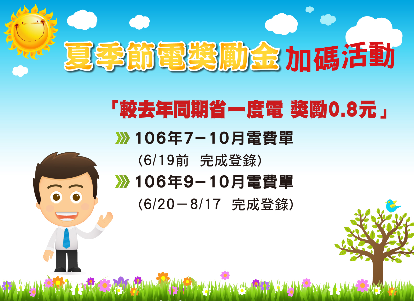 為喚起民眾節電意識並落實自主節電,針對廣大住宅用戶及國中小學用戶,台電公司特別推出「夏季節電獎勵金加碼」活動,凡於活動期間至台電活動網站完成相關資料登錄,並於夏季期間確實降低用電,每節省1度電即可獲得0.8元節電獎勵金,加碼幅度高達3成,期透過誘因機制,讓人人都可成為抑低尖峰的小尖兵。另推動「夏日酷涼分享」活動,增加民眾自願落實節電之選項,並與服務業及節能場域合作,給合消費抽獎優惠,鼓勵民眾在炎熱夏季前往公共場所,透過能源共享或戶外活動,達到節電成效。
