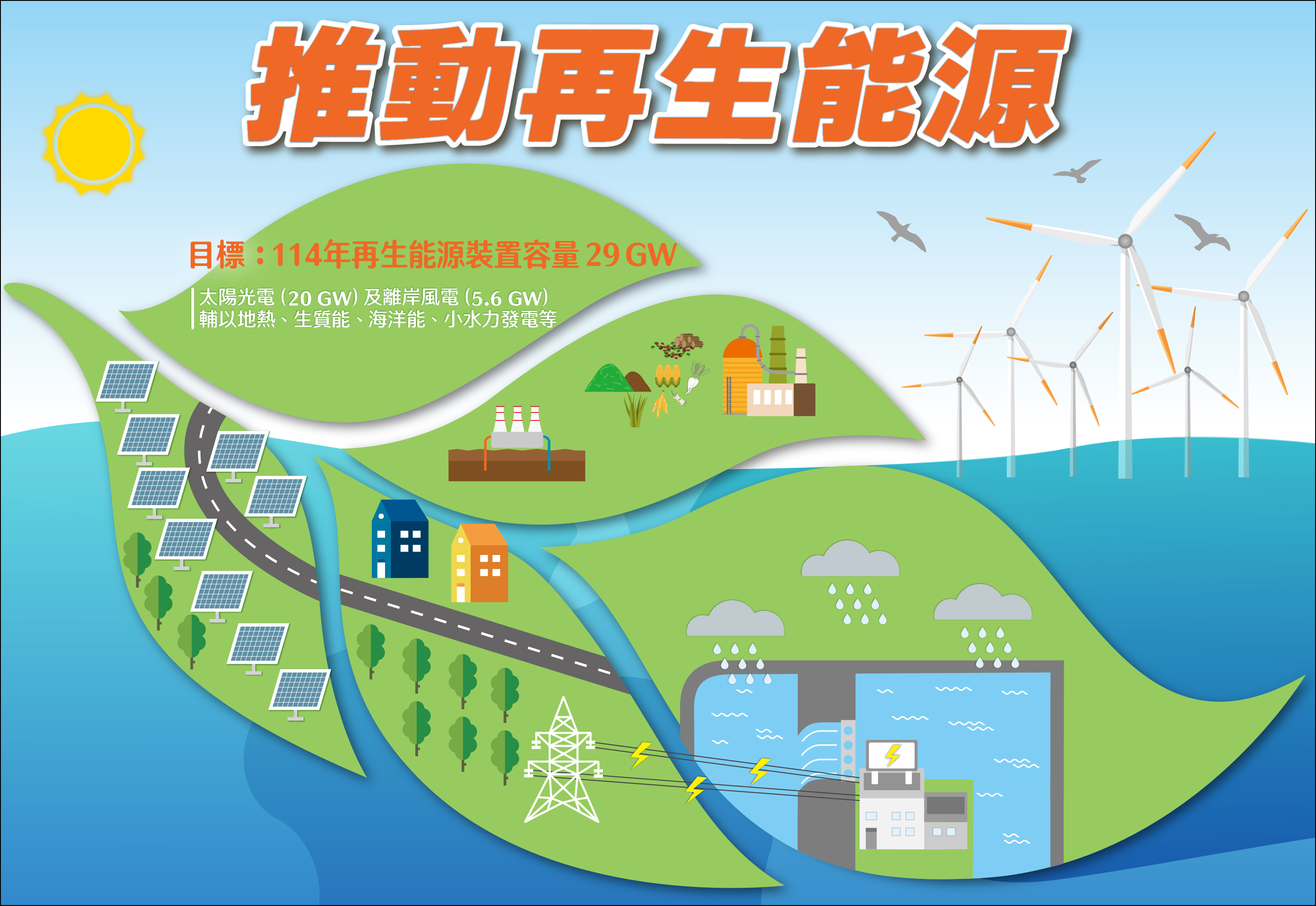 為因應國際減碳趨勢、提升我國能源自主及改善民眾生活環境品質,政府自105年5月啟動能源轉型,以「減煤、增氣、非核、展綠」為發展方向,完整擘劃我國再生能源發展路徑及策略,明訂114年再生能源裝置容量29 GW(10億瓦)之政策目標,以太陽光電(20 GW)及離岸風電(5.6 GW)為推動主軸,同時積極布局前瞻能源發展(如地熱、生質能、海洋能、氫能等),另分別於108年及112年修正《再生能源發展條例》,優化推動法制環境,以確保電力穩定供應,兼顧降低空污及減碳,加速我國達成淨零轉型願景。