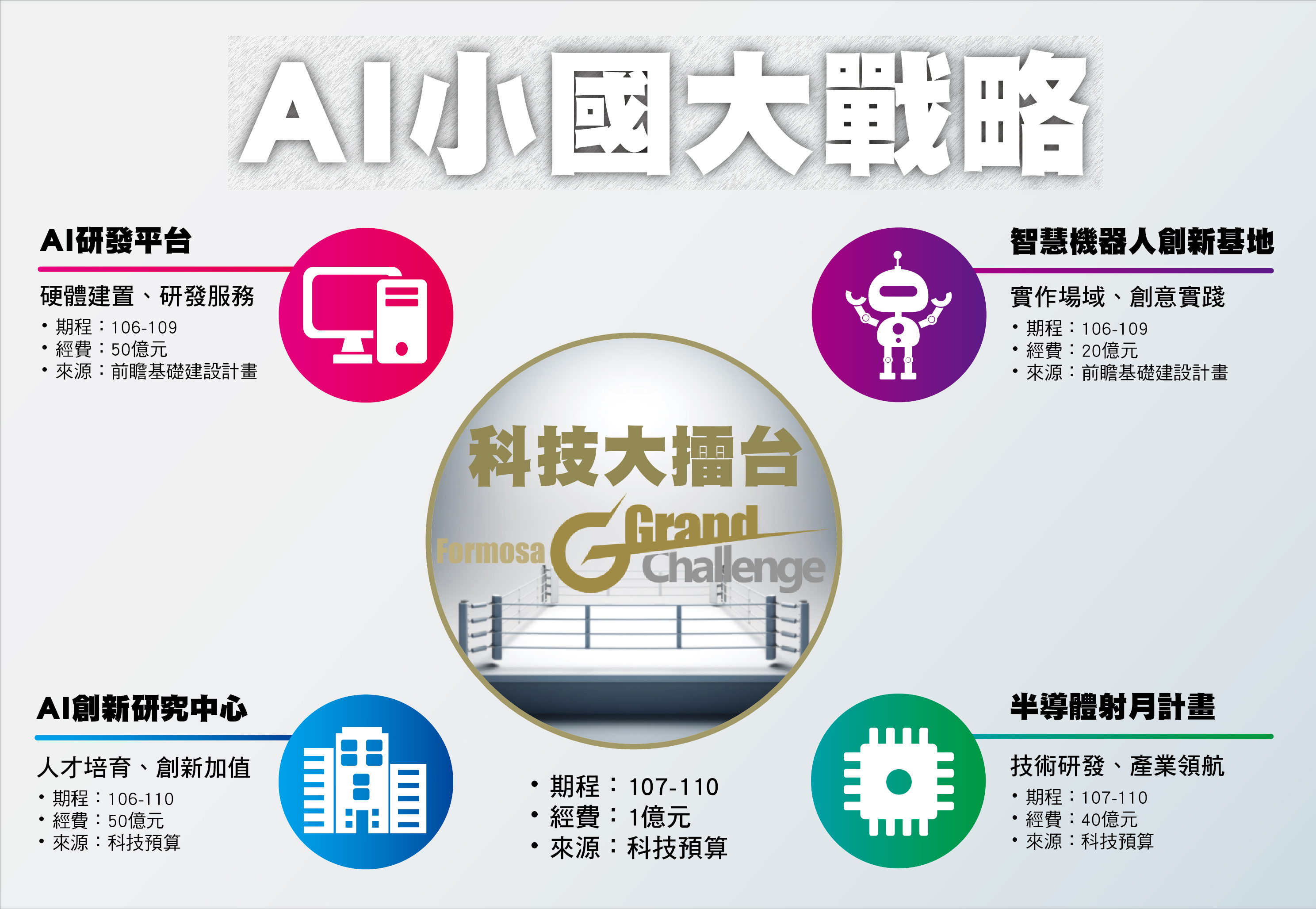 台灣雖為小國,但具有半導體製造技術領先全球、優異的次系統開發能力,及完整人才培育體系等優勢,面對經費、人口、產業規模等先天條的限制、挑戰。鑒此,為培育AI科技人才及建置AI科研環境,科技部以「小國大戰略」的思維,擬定了AI推動策略,預計5年(106-110年)投入約160億元經費,選擇與聚焦半導體、資通訊技術等台灣具機會及優勢的強項,及物聯網系統與安全、無人戴具等未來趨勢的領域,期創造更多的創新價值,提升人民會福祉,邁向智慧創新國家。