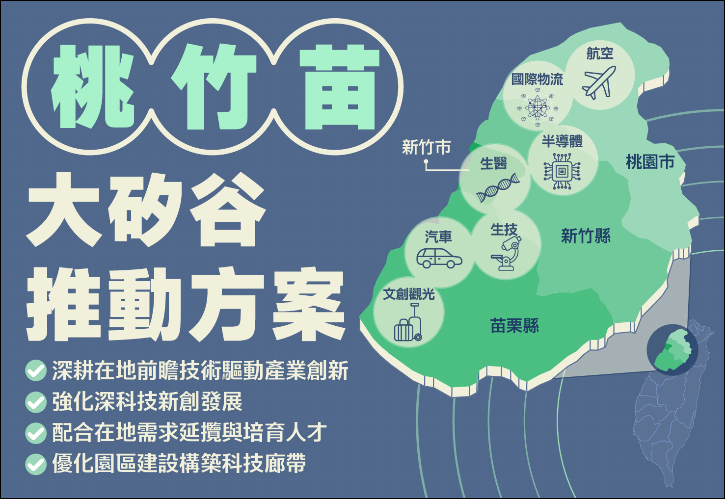 桃竹苗地區因新竹科學園區四十多年來的發展,科技產業上中下游供應鏈完整,並具有桃園機場空港國際物流的有利條件,產官學研與新創能量豐沛,已成為我國半導體產業聚落重鎮。考量桃竹苗地區產業與園區基礎設施完善,科技廊帶已逐步成形;另參考其他國家半導體產業布局均是基於區位優勢發展(如美國亞歷桑那、南韓首爾、日本九州等),政府爰推動「桃竹苗大矽谷推動方案」,投入政策資源,串聯桃竹苗產業技術、新創聚落與園區量能,以建構引領全球的產業生態圈。