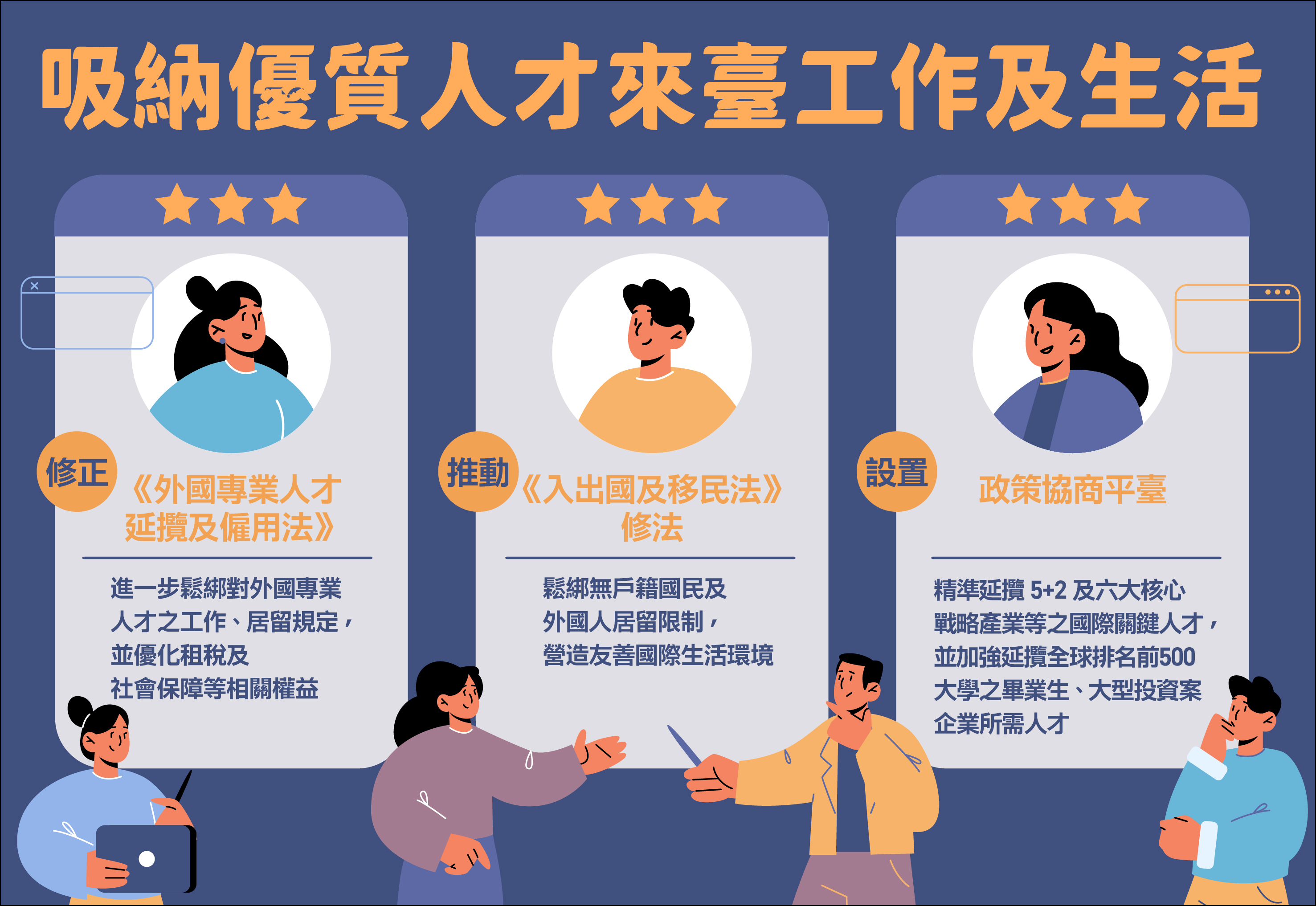 近年來我國面臨國際人才競逐及國內人才流失等挑戰,為填補產業所需人才及技術缺口,《外國專業人才延攬及僱用法》(下稱外國人才專法)於107年2月施行,並於110年10月修正,進一步鬆綁對外國專業人才之工作、居留規定,並優化租稅及社會保障等相關權益。另國發會自110年7月設置政策協商平臺,以加強延攬及留用國際人才的力道,充實我國「5+2」產業創新計畫及六大核心戰略產業人才,期有效因應全球產業供應鏈重組所牽動的國際人才流動。此外,為提高優質人才來臺及留臺誘因,行政院於112年1月12日將《入出國及移民法》修正草案函送立法院審議(註:業經立法院112年5月29日三讀通過),透過鬆綁停居留規定,以營造更優質友善的攬才及居留環境。