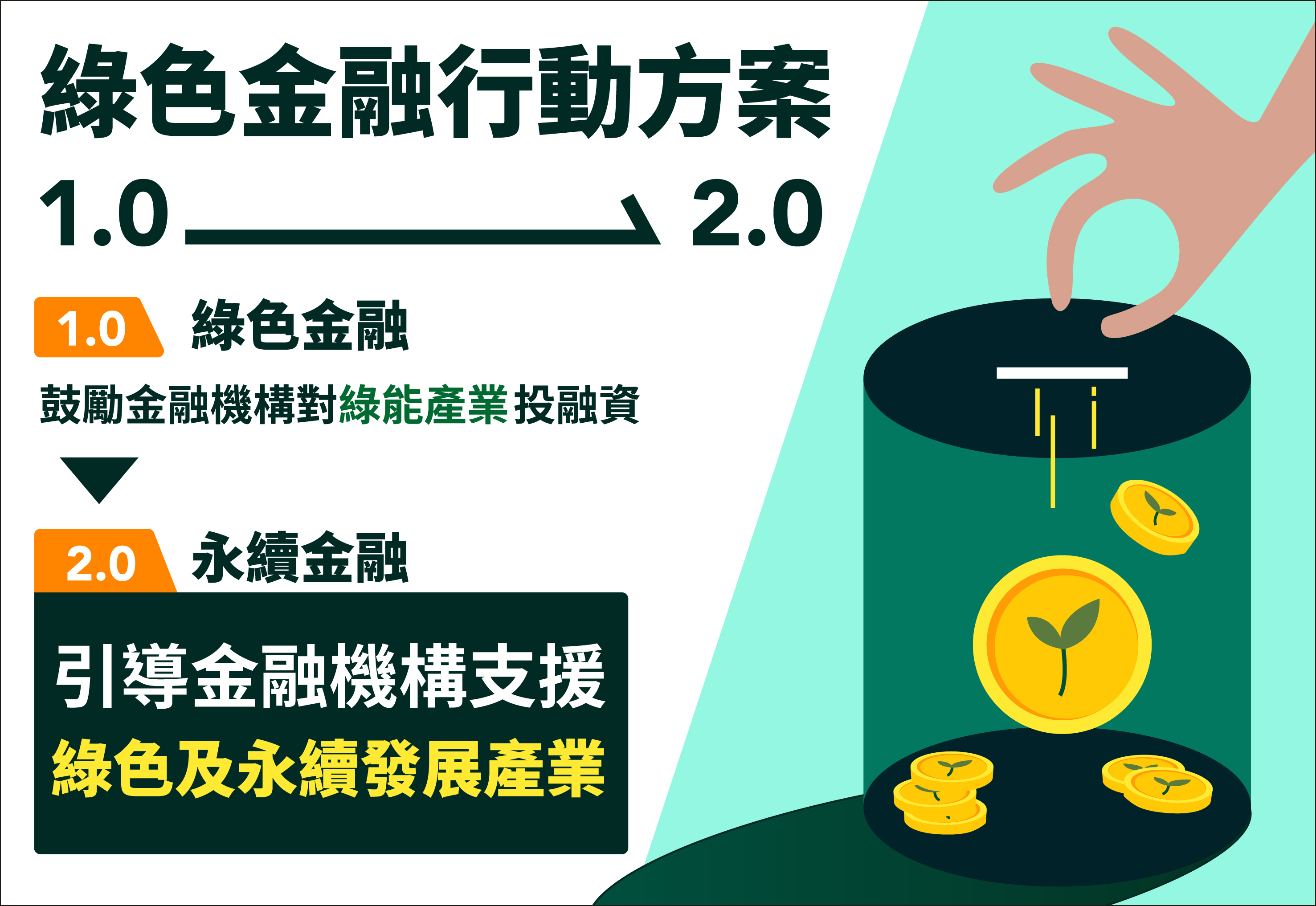 為順應綠色金融之國際發展趨勢,並配合我國非核家園、能源轉型、環境減排等重大政策,金管會自106年起推動「綠色金融行動方案1.0」,涵蓋授信、投資、資本市場籌資、人才培育、促進綠色金融商品或服務深化發展、資訊揭露、推廣綠色永續理念等7大面向,除協助綠能業者,取得營業發展所需資金,亦期促使金融市場引導實體產業、投資人、消費者重視綠色永續,讓臺灣轉型為綠色低碳經濟、綠色投資、綠色消費與生活。