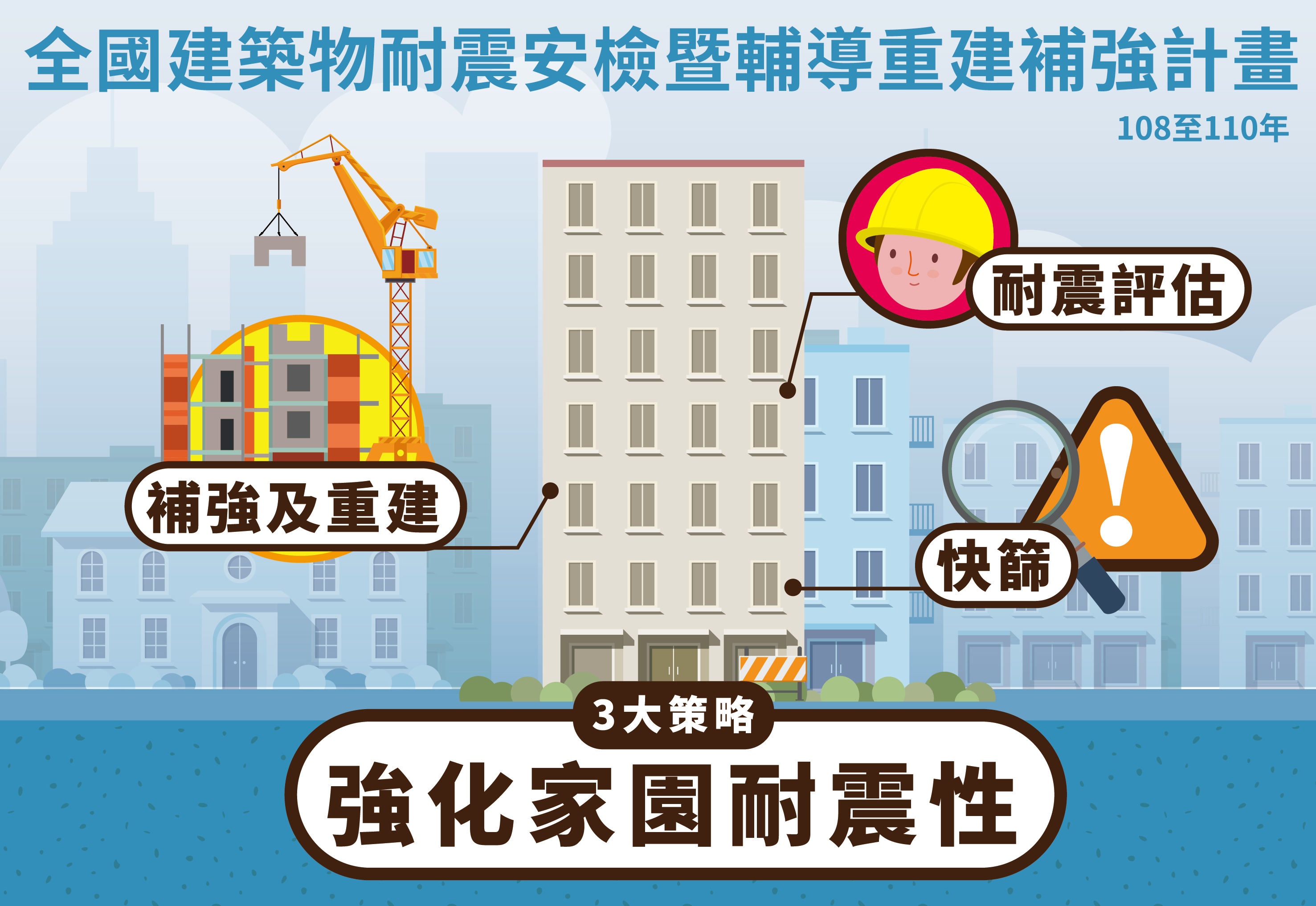 有鑑於此,政府除已完備都更三法—《都市危險及老舊建築物加速重建條例》(106年5月10日制定公布)、《國家住宅及都市更新中心設置條例》(107年2月14日制定公布)及《都市更新條例》(108年1月30日修正公布)外,並已核定「全國建築物耐震安檢暨輔導重建補強計畫」(108至110年),預計3年投入約54億元預算,全面執行全國危險及老舊建築物(簡稱「危老建物」)快篩、耐震評估、補強及重建,期降低震災造成的危害,讓國人可以住的更安心與安全。