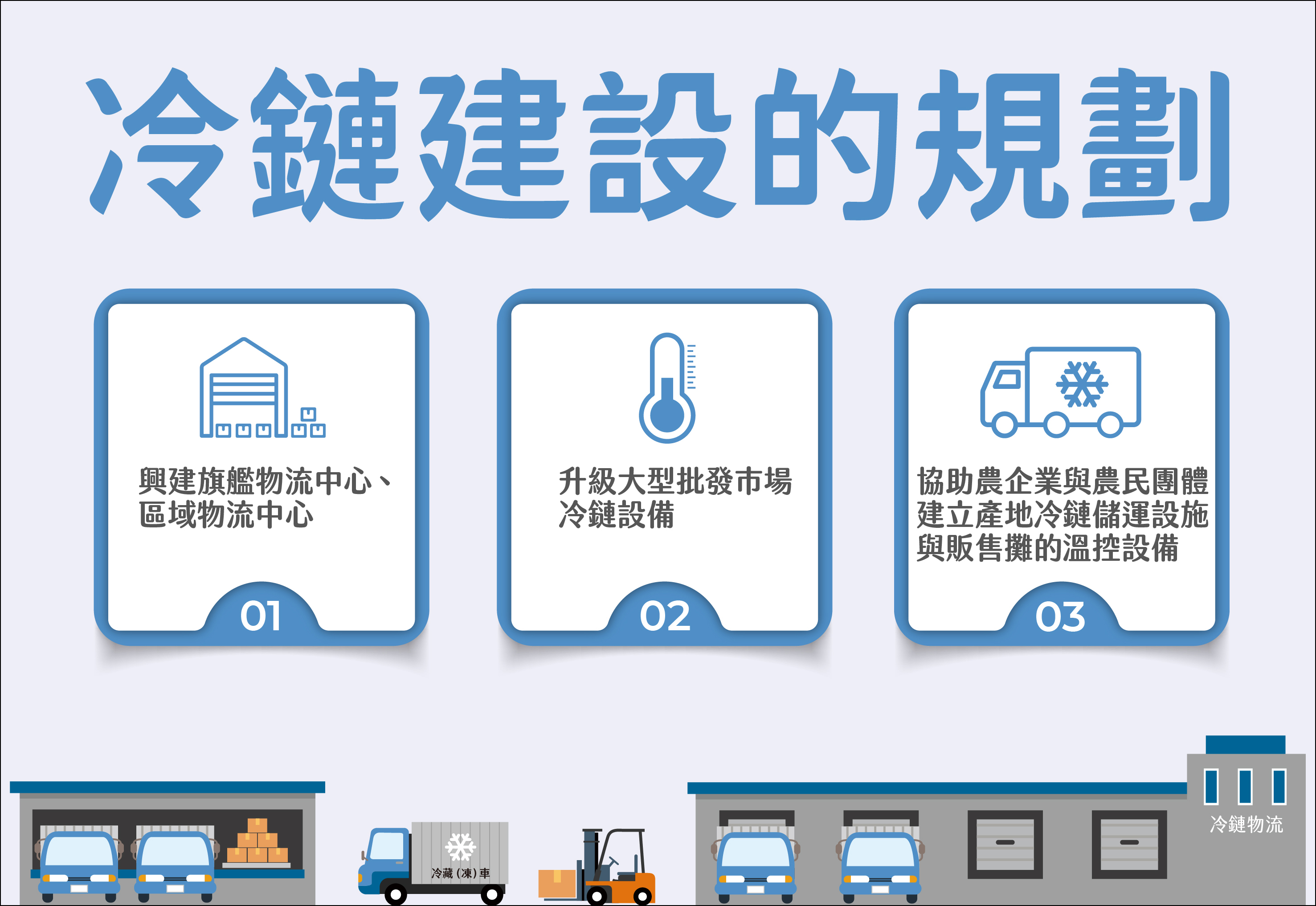 針對全國農、漁、畜產業,同步加速興建旗艦物流中心及區域物流中心、升級大型批發市場冷鏈設備、協助農企業與農民團體建立產地冷鏈儲運設施與販售攤的溫控設備。