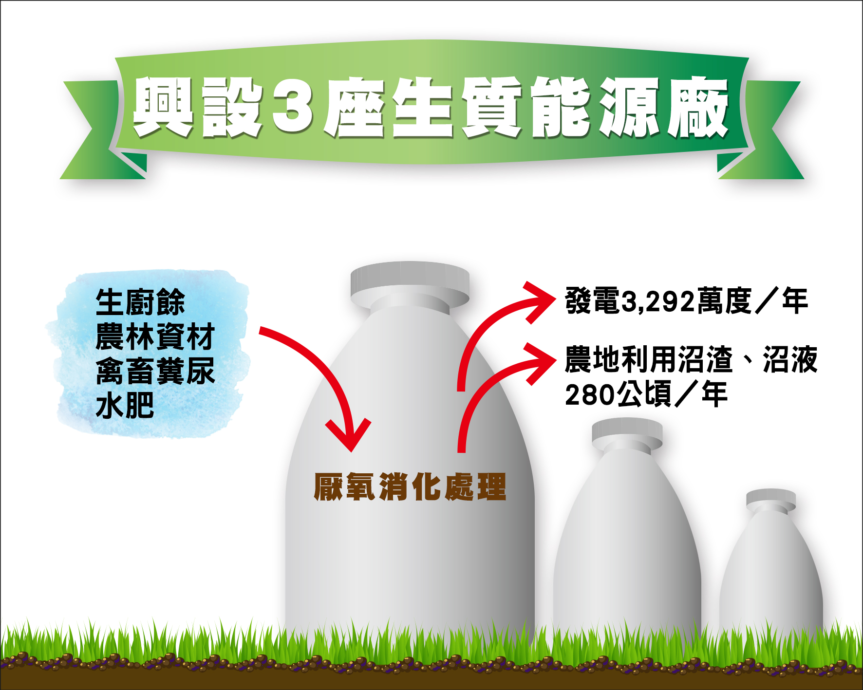 - 策略:興建至少3座廚餘生質能源廠,有效提升生廚餘、農林資材、禽畜糞尿、水肥等有機廢棄物去化管道,產出之沼氣純化後用於發電,沼液、沼渣供農地提升肥份利用。