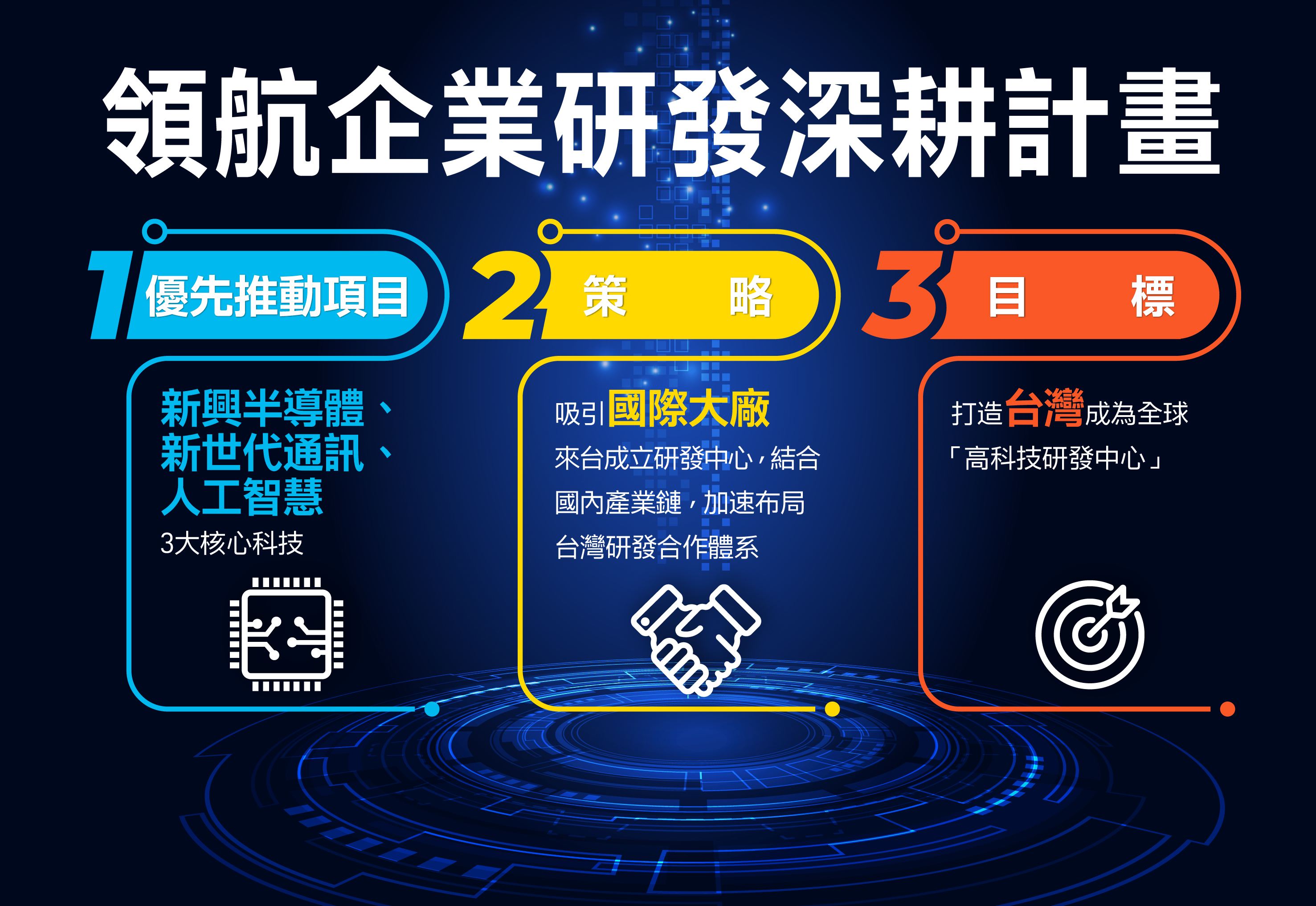 在全球產業供應鏈面臨重整之際,強化資訊及數位相關產業發展,已是台灣未來要發展的六大核心戰略產業之一。未來將利用我們於半導體和資通訊產業的優勢,深耕新興半導體、新世代通訊、人工智慧等三大核心科技,以支撐與實現六大核心戰略產業發展,全力搶占全球產業供應鏈的核心地位。推動台灣成為高階研究、高端產品、先進製程及創新應用的全球高科技研發中心,為台灣長遠的經濟發展打下厚實基礎。