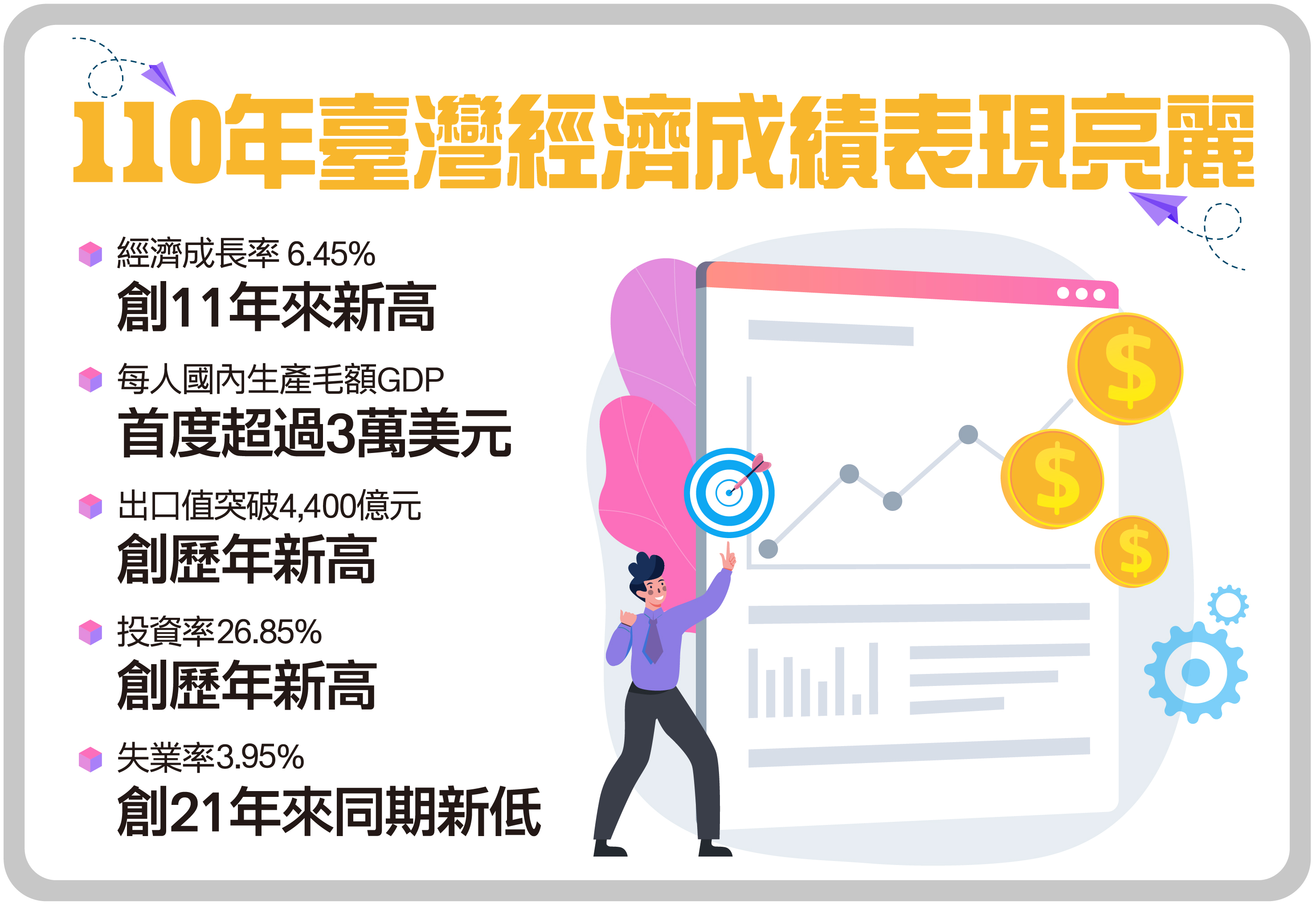 全球COVID-19疫情延燒逾兩年,近期各國續飽受新型變種病毒Omicron爆發之苦,而相較部分國家,臺灣在政府、產業、國人共同努力下,去(110)年不僅守住了疫情,國民生活能如常運作外,在經濟成長率、外貿、投資、消費等面向,皆有亮眼成績,如經濟成長率6.28%,創11年來新高;每人國內生產毛額(GDP)更首次超過3萬美元,顯示我國經濟結構轉型初見成效,在疫情下也更具韌性。