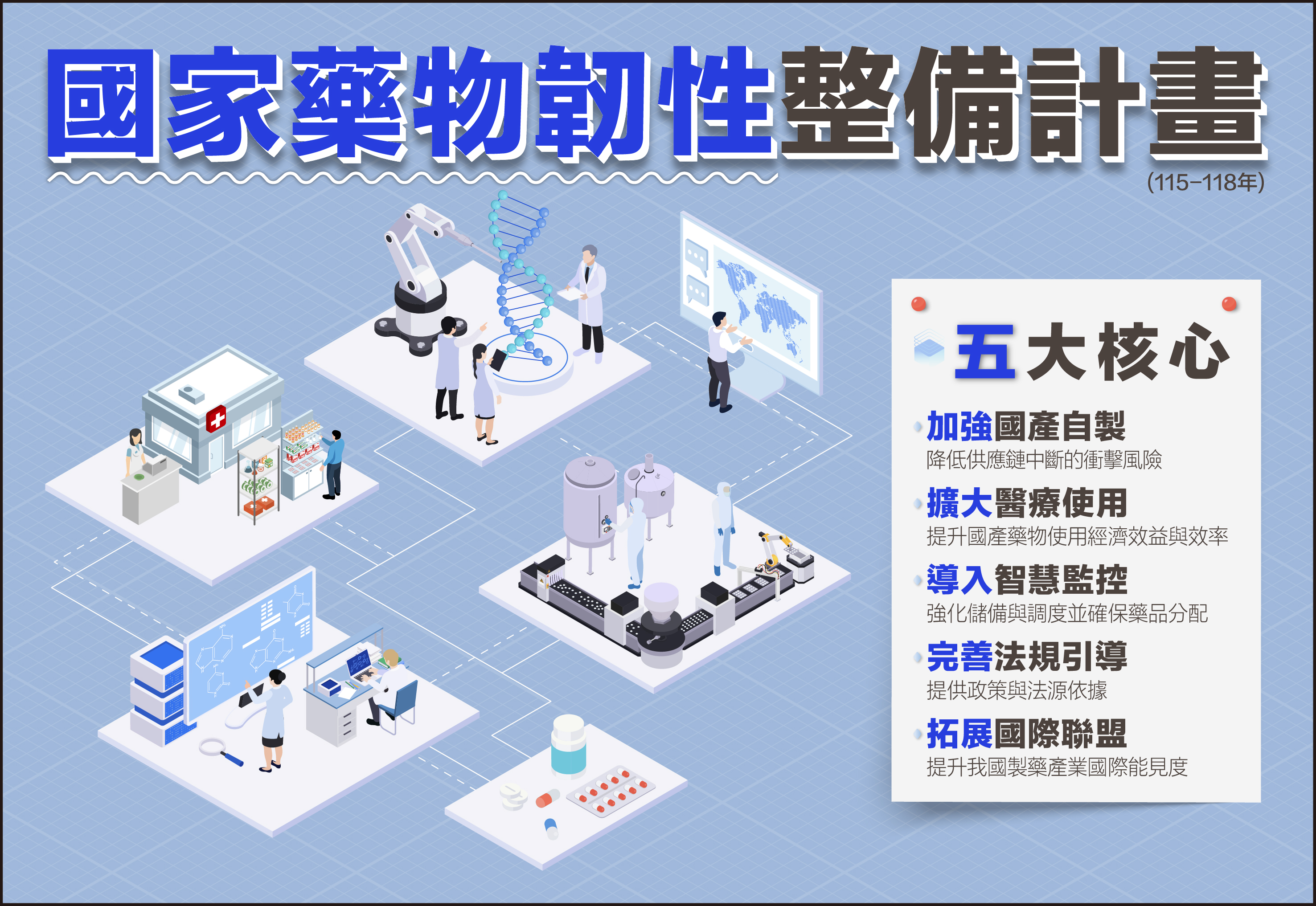 鑑此,為提升我國關鍵藥物自製能力及供應鏈韌性,行政院核定「國家藥物韌性整備計畫」(115-118年),預估總經費240億元,期透過行政部門整體性策略與行動方案,全面強化我國藥物自主製造、安全儲備與供應調度體系,以提高醫療體系在面對緊急狀況時的應變能力,並穩定關鍵藥品的供應,進而以國造藥物為核心,啟動兆元經濟產業動能,建構醫療防線,並領航臺灣生醫產業發展。