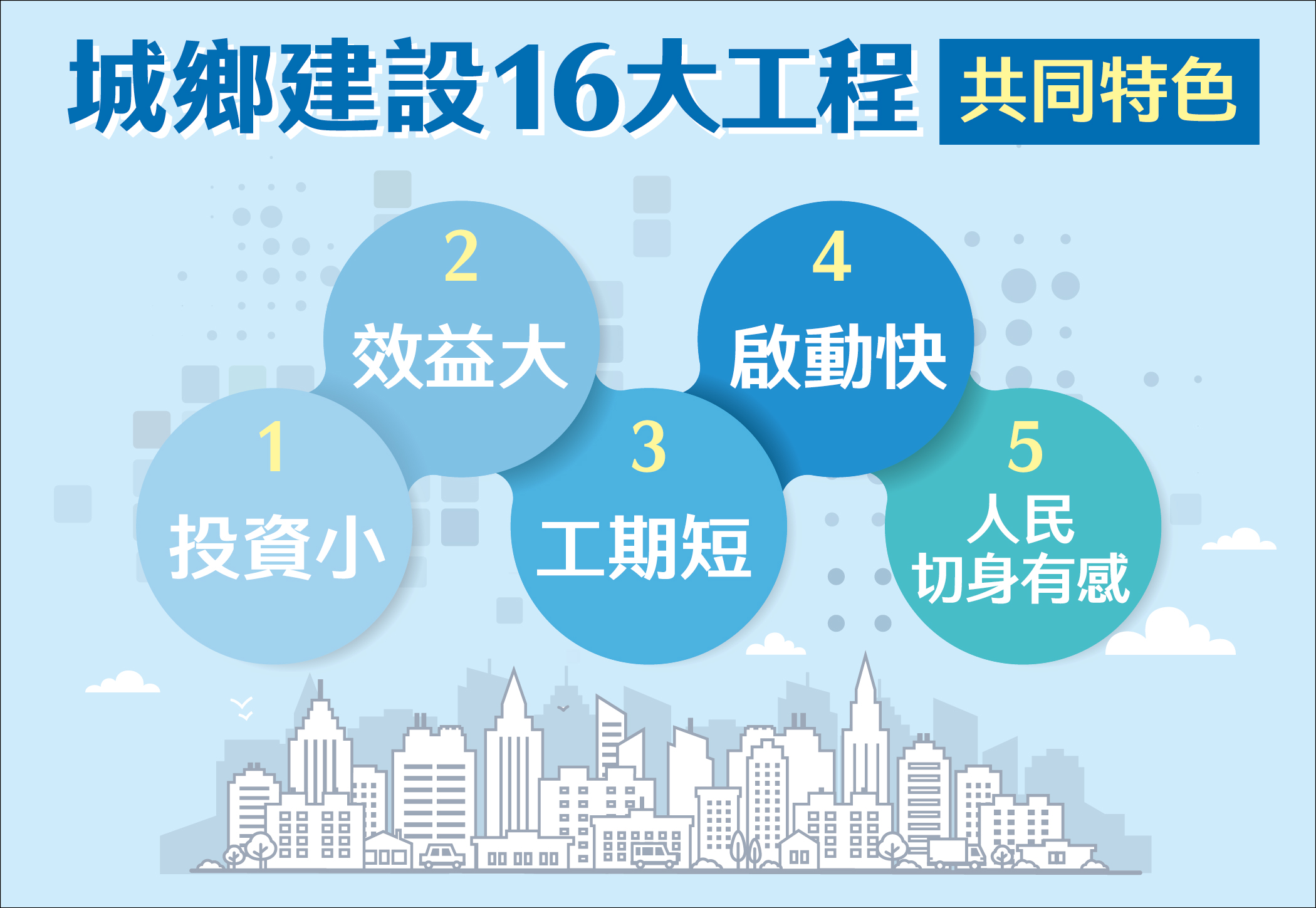 為提升公共環境品質、改善民眾生活條件,並助提升國家整體形象,「城鄉建設」除由中央主導的大型計畫外,也支持全國各縣市提出符合地方的建設主題,於106-114年推動16項建設計畫,涵蓋交通、社福、產業、文化、觀光等面向,其共同特色為投資小、效益大、工期短、啟動快,以人民切身有感為核心思考,針對城鄉生活現況,投入適當建設。