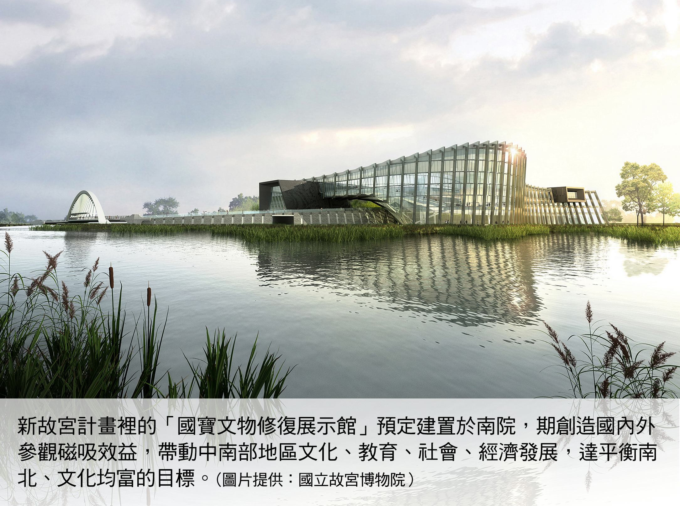 預定於博物館區 20 公頃範圍內增建國寶館,定位為強化博物館典藏功能、文物修復使命與修復人才培育,空間建置包括:文物修復實驗室、文物典藏庫、展示教育空間、國際特展借展廳、委外營運空間等。其中開放式庫房將採可呈現觀賞規劃設計,讓民眾進入參觀,且規劃不同用途的教育推廣空間;增加故宮南院典藏展示空間以期舉辦國際級大型展覽,連結亞洲多元文化提供主題文物修護暨體驗空間。同時搭配地方政府共同串連文化與產業,發揮博物館磁吸與觀光外溢效益,帶動城市再造,推動中南部縣市藝術扎根、優化雲嘉南區域文化觀光資源。