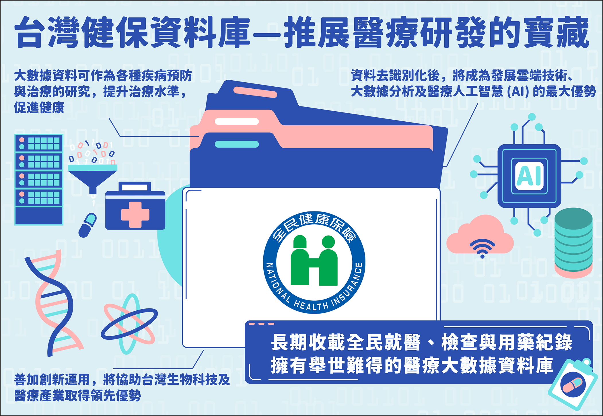 此外,健保累積了24年的全民健保資料,收載民眾就醫紀錄、藥品資料、醫療影像、檢驗數據及其他跨機關資料,讓台灣健保資料庫成為世界各國矚目極具價值之醫療大資料庫;另健保資料庫去識別化後的就醫資料,更成為台灣發展雲端技術、大數據分析及醫療人工智慧(AI)的最大優勢,多年來政府已善加創新運用,期協助台灣健康醫療生技產業發展與升級,帶動健康醫療領域新藍海。