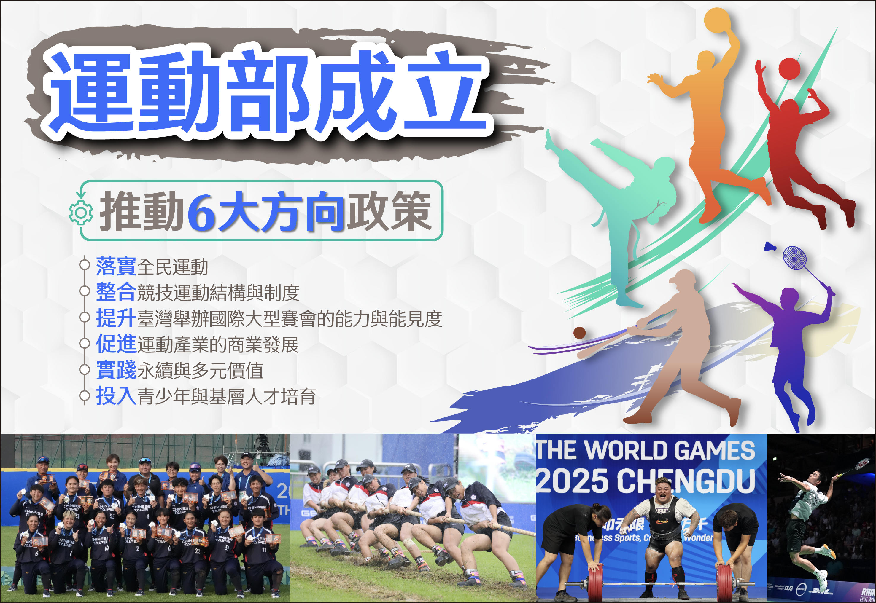 運動是全民共享的權利,更是展現國家實力的重要象徵。為使臺灣在運動發展上持續精進,政府正式成立運動部,並於115年度中央政府總預算中於體育項下編列248億元,展現推動體育的堅定決心。未來將持續強化競技運動支持體系,積極推廣全民運動,促進體育產業發展,進而帶動運動經濟與內需成長,期能與全體國人攜手共進,開創臺灣運動新時代。