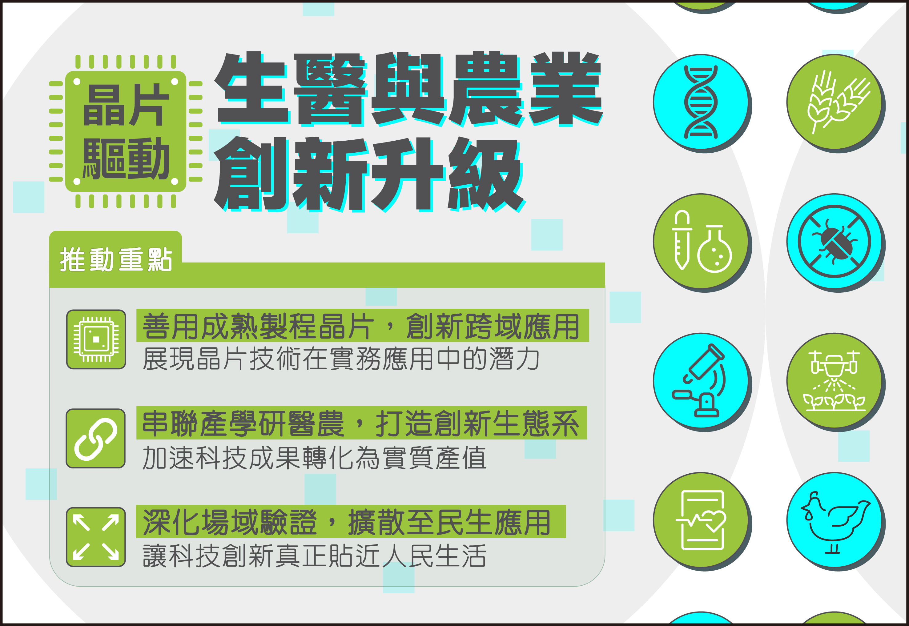 隨著人工智慧崛起,晶片已是各行各業突破創新的動力來源。為迎接未來產業科技變革的契機與挑戰,政府前已提出「晶片驅動臺灣產業創新方案」(簡稱「晶創臺灣方案」),全程為十年期,在四大布局中的「結合AI·晶片帶動全產業創新」部分,係運用我國半導體晶片製造與封測領先全球的優勢,結合AI等關鍵技術發展創新應用,並擴散在百工百業,其中之一即是帶動生醫與農業的產業創新升級。