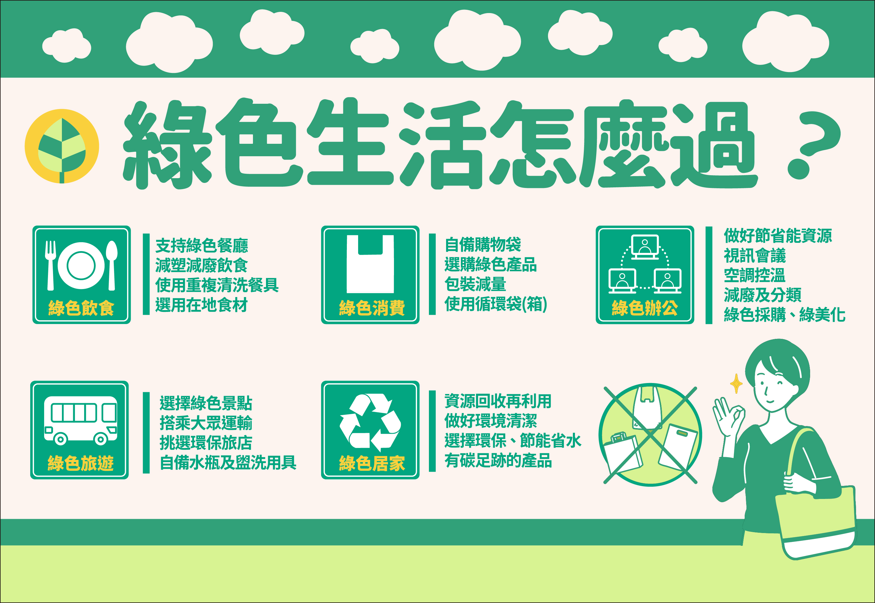 因全球暖化持續增溫,極端天氣頻仍,為緩解氣候變遷對人類生存造成的重大衝擊,溫室氣體減量已成當前各國刻不容緩的課題。我國為善盡共同保護地球環境之責任,除依《溫室氣體減量及管理法》所明訂的國家溫室氣體長期減量目標,制定氣候變遷調適策略,降低與管理溫室氣體排放外,並持續推動資源回收、減塑及限塑政策、汰換老舊機動車輛、節能省水、公共運輸、有機在地食材及雲端發票等措施,鼓勵民眾從食、衣、住、行、育、樂、購等生活小細節力行「綠生活」,落實生活環保。