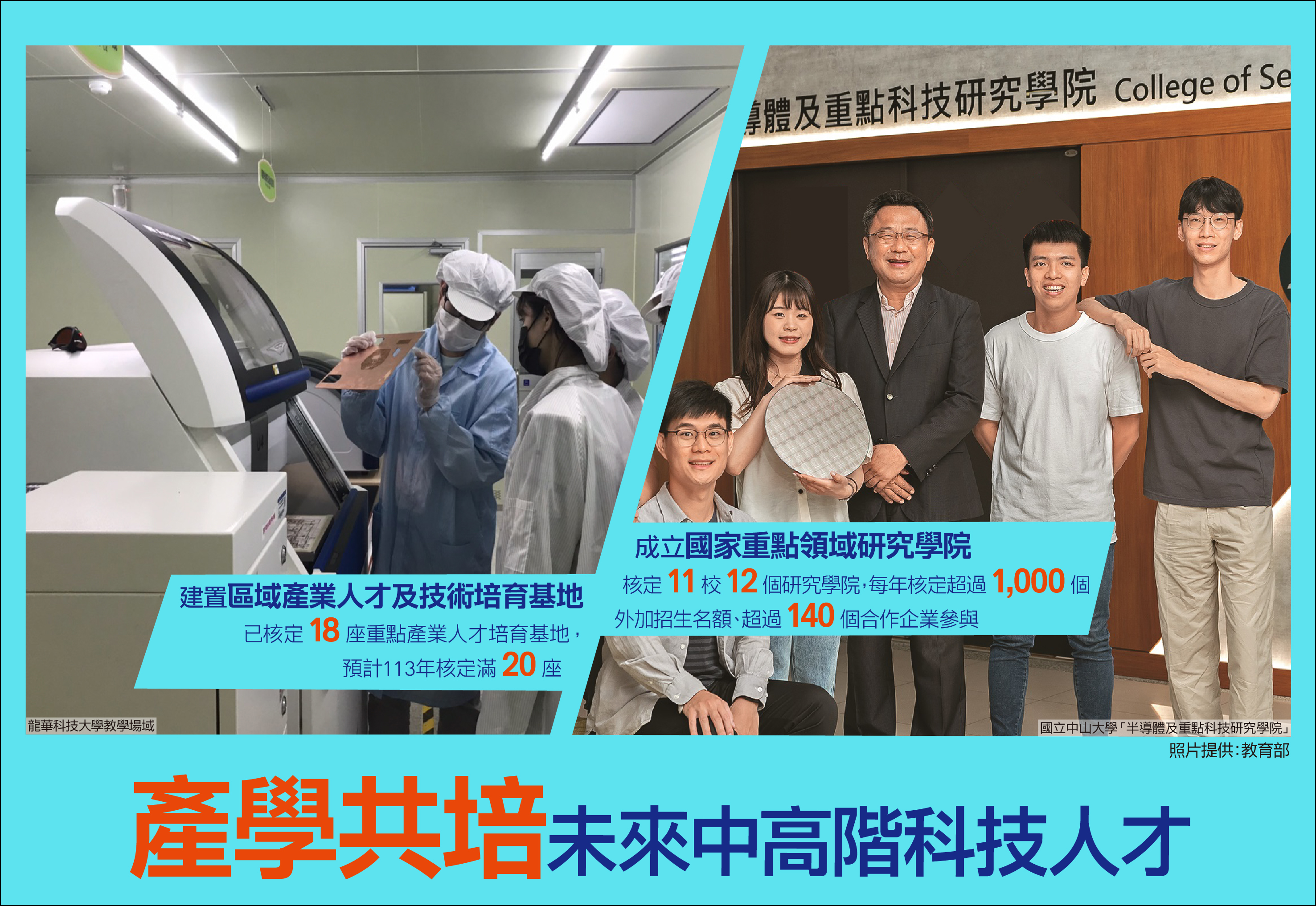 產業發展與優質人才培育息息相關,政府針對當前國家重點產業人力需求,110年公布《國家重點領域產學合作及人才培育創新條例》,主要是由研究頂尖的國立大學與研發領先的企業合作設立「國家重點領域研究學院」,藉由放寬組織、人事、財務、設備資產、人才培育及採購事項,讓產業能有效、有序地參與產學研發;國立大學亦可透過研究學院以8至12年為期來推動創新,擴大延攬高階人才。