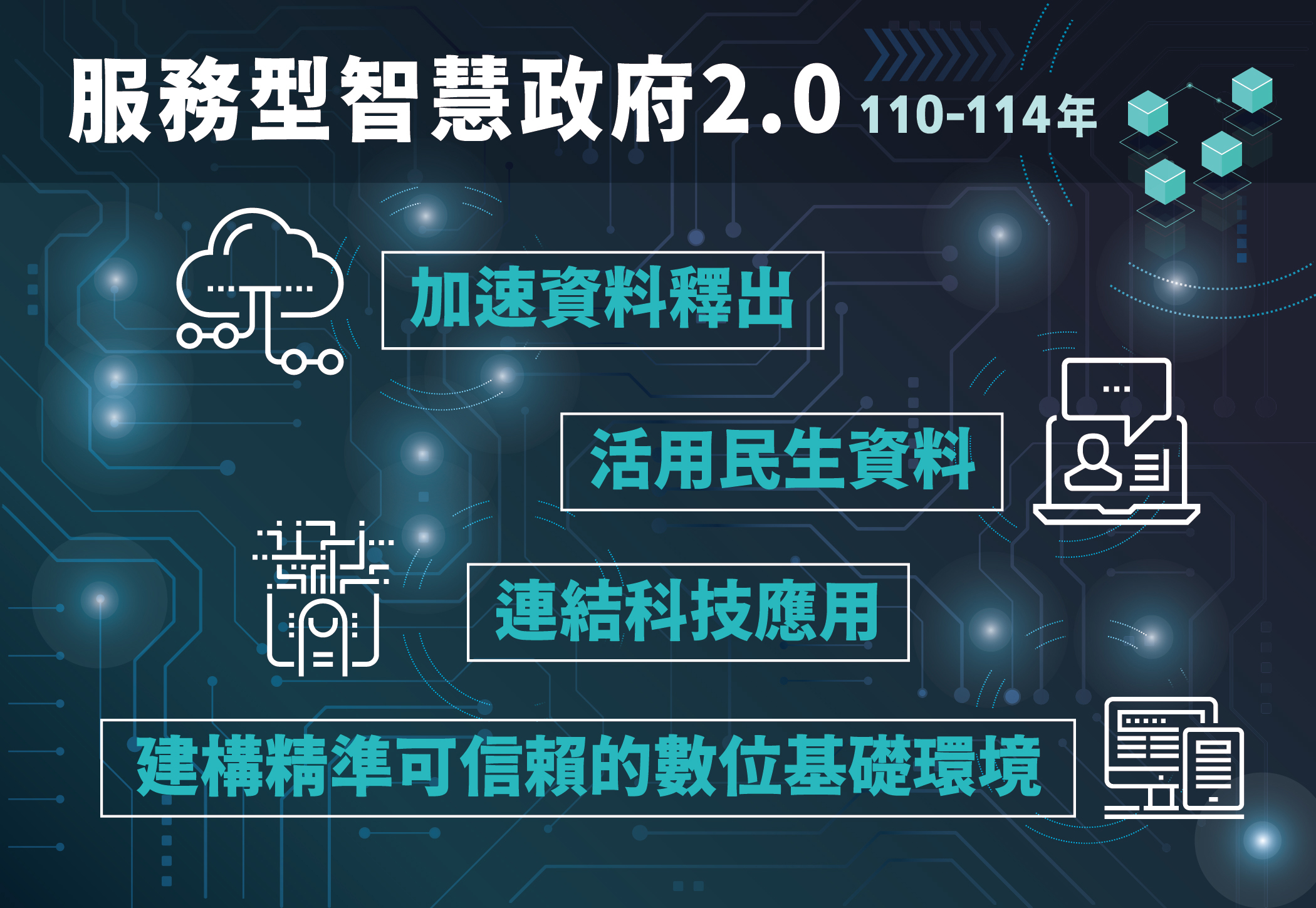 為運用開放資料強化智慧政府治理能量,並鼓勵民間多元應用,創造資料經濟,推升我國數位競爭能力,政府自110年起執行「服務型智慧政府2.0推動計畫」(110-114年),將以民眾需求為出發點,深化智慧政府各項作為,同時厚植數位經濟基礎及加強數位治理效能,打造精準可信賴的智慧政府。