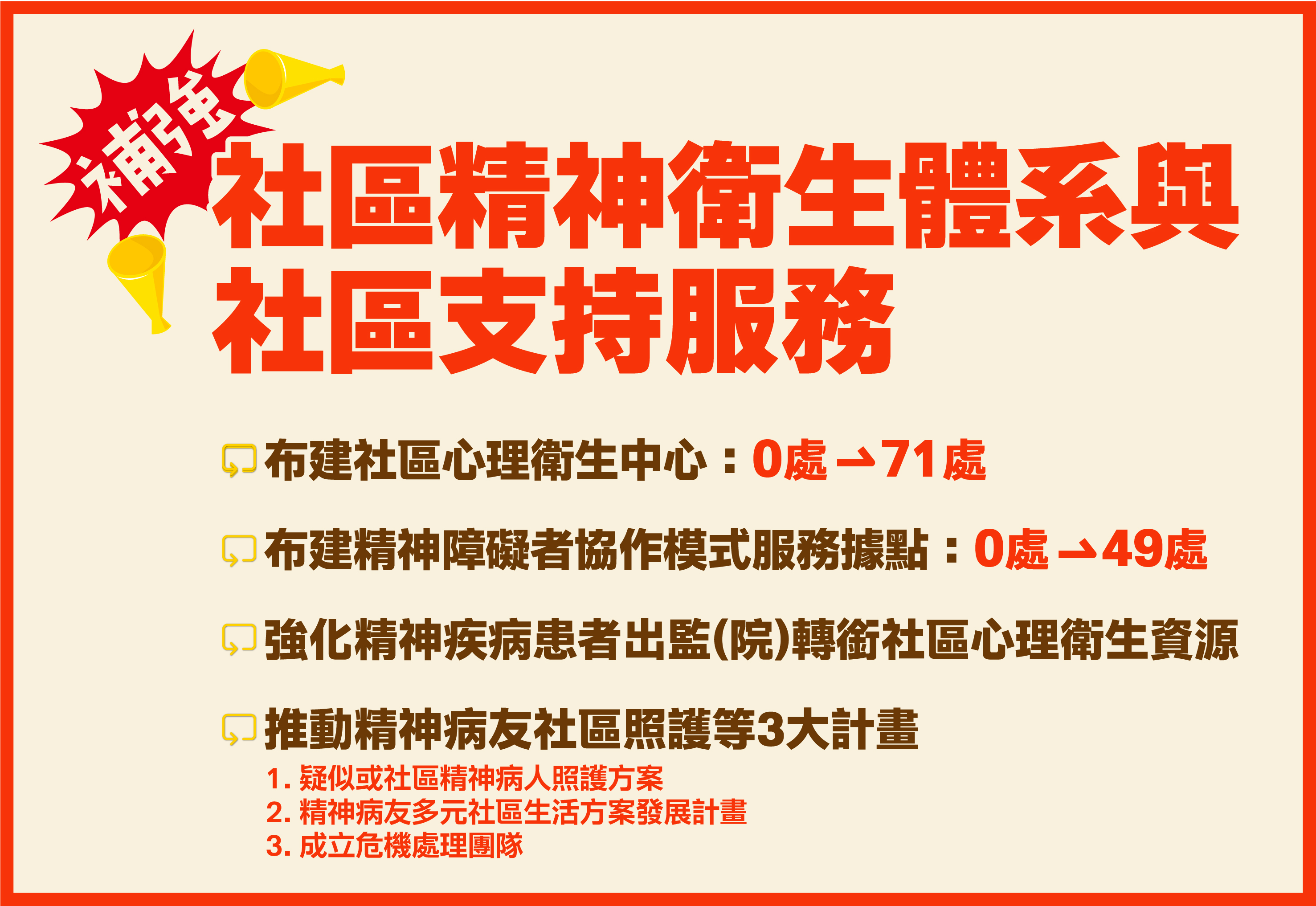■ 推動疑似或社區精神病人照護、成立危機處理團隊、精神病友多元社區生活方案發展等精神病友社區照護3大計畫。