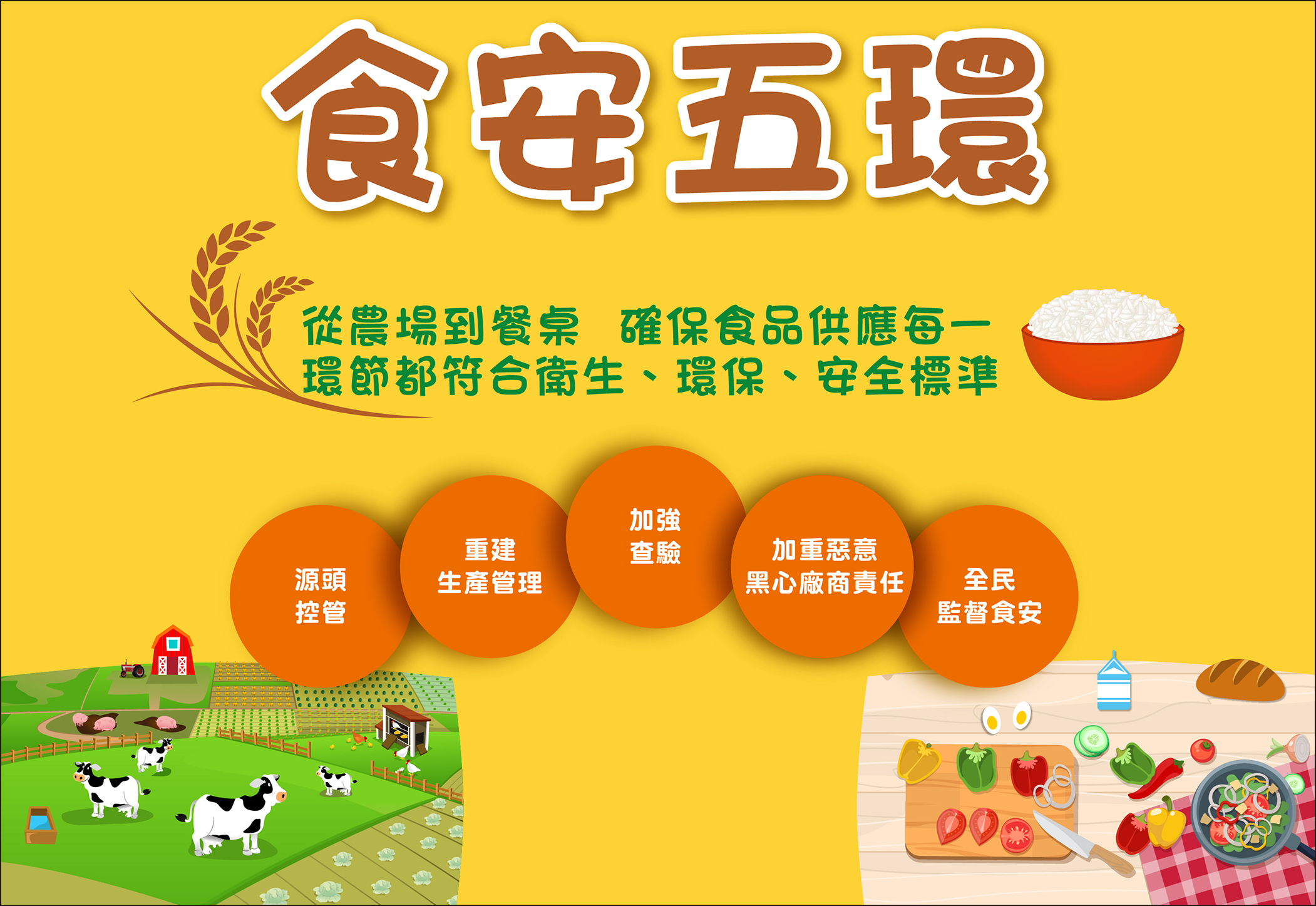 食品安全一直是政府施政的重點,為提升食安管理,自105年6月起即推動「食安五環」政策,以「源頭控管」、「重建生產管理」、「加強查驗」、「加重惡意黑心廠商責任」及「全民監督食安」等5大面向,做為我國食安升級推動的方針,透過跨部會、跨領域協力治理,結合政府管理、產業自律及民間參與,共同守護民眾從農場到餐的食品安全。
