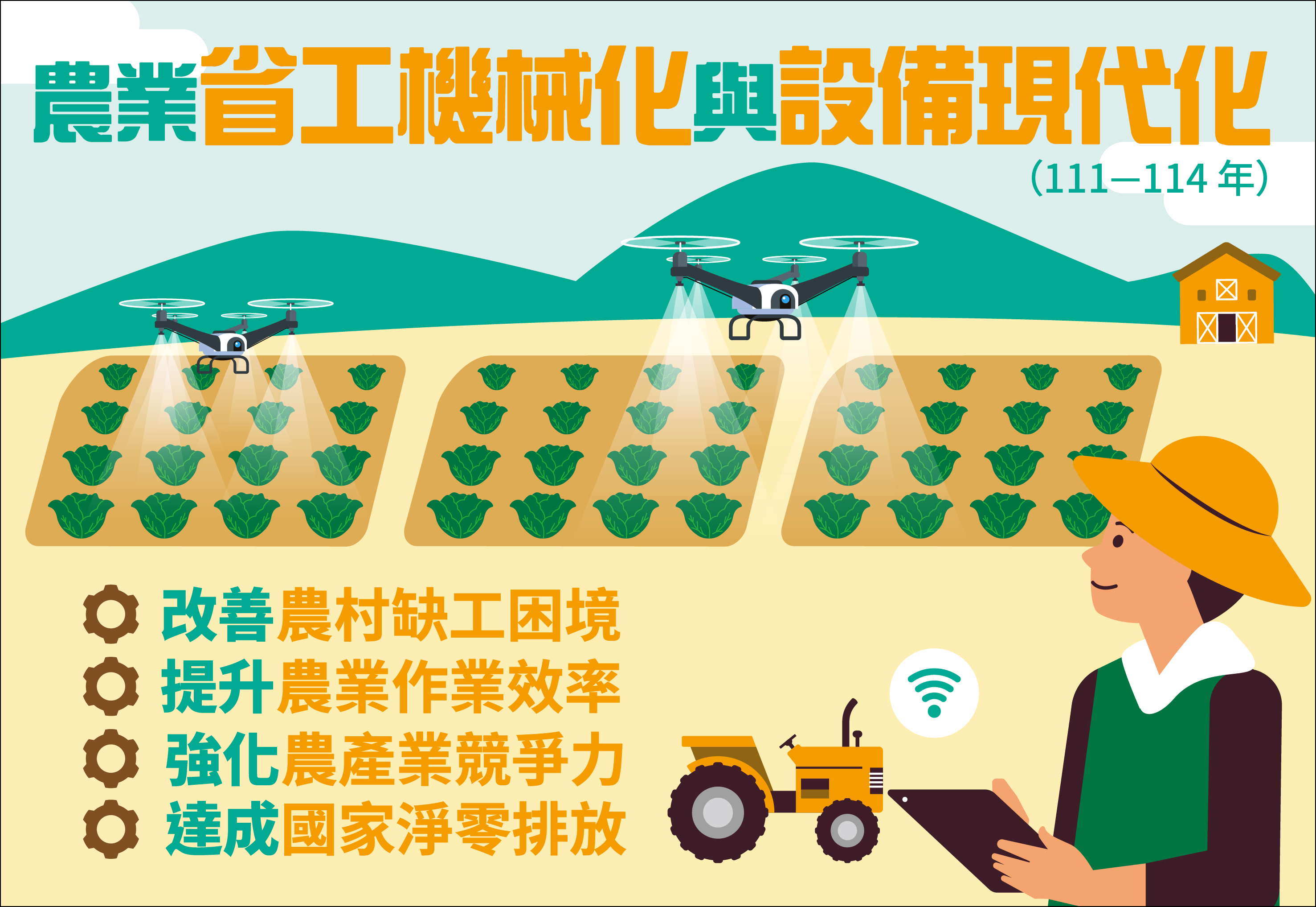 鑑於農機補助政策有助提高種植收穫的效率,更可同步結合「全國冷鏈物流計畫」(請參考〈推動農產品全國冷鏈物流〉),達到產製儲銷一貫化作業,提升農民收益及糧食自給率,成果顯著,故政府未來4年(111—114年)將再投入92億元經費,推動「農業省工機械化及設備現代化方案」,除持續輔導農友購置普遍需求之農業機械外,更將就其他林漁畜各產業別全面推動自動化、機械化,以進一步提升農業作業效率,改善農村缺工困境,強化臺灣農產業競爭力,並協助達成國家淨零排放願景。