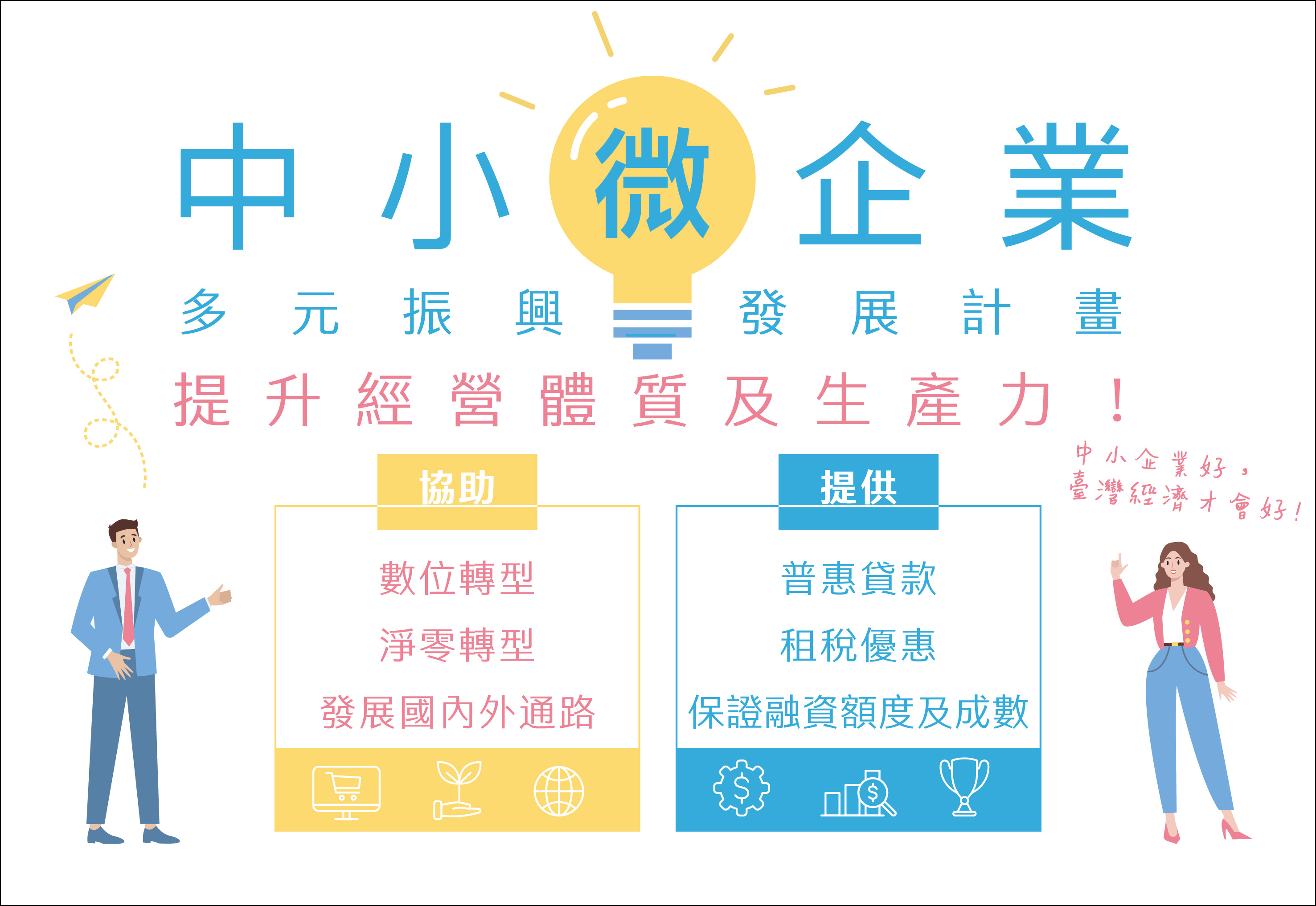我國經濟發展除有護國神山和護國群山的神助攻外,那些擁有更多從業人員的傳統產業與中小微企業,打造出健全的產業供應鏈基礎,更是功不可沒,長期以來一直是臺灣最重要的經濟命脈之一。因此,為促進中小微企業的多元振興及持續發展,政府114年投入116億元,推動「中小微企業多元振興發展計畫」,透過「3大策略、3大配套」,並建立單一服務窗口,協助聚焦於數位轉型、淨零轉型及通路發展,以達成提升企業員工薪資水準及落實「包容成長」之政策目標。