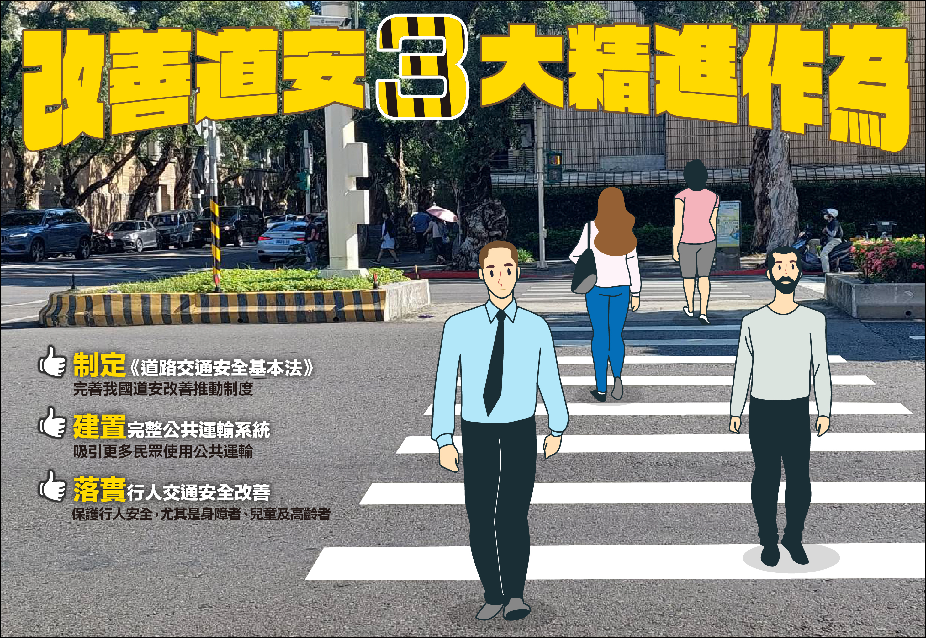 為展現政府澈底改善道安的決心,行政院除於112年5月通過「行人優先交通安全行動綱領」,再於同年8月17日通過更上位的「行人交通安全政策綱領(2023-2027)」,以3大精進作為,提出短、中、長期執行項目。此外,《道路交通安全基本法》也已於113年1月1日施行,確立我國道路交通安全政策方針,希望藉由中央、地方與全民通力合作,達成2030年前降低道路交通事故死亡人數50%之目標,並朝長期「零死亡」(Vision Zero)邁進。
