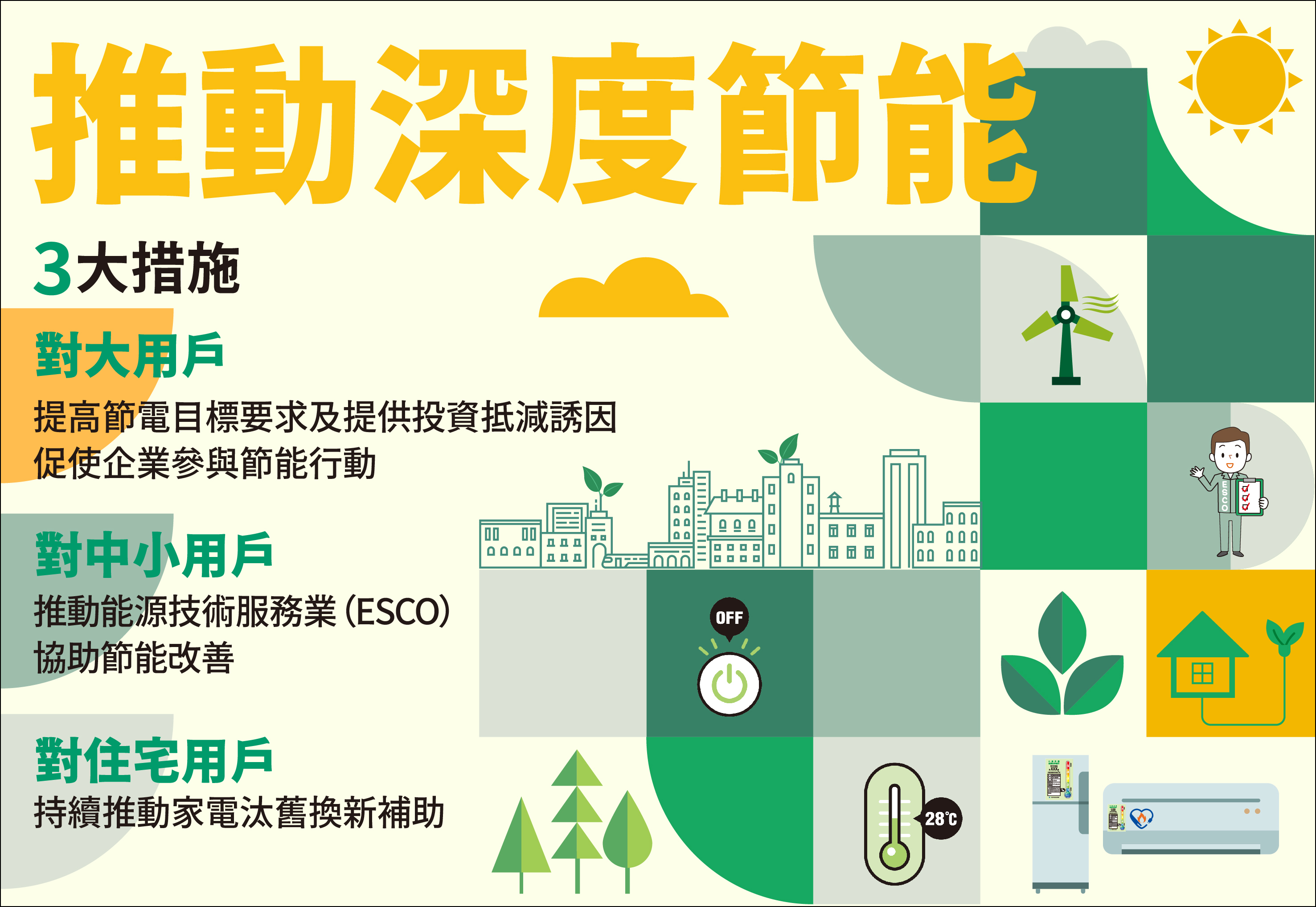 鑑此,政府近5年(108-112年)致力能源轉型、節能推動、製程改善,我國能源效率年均改善率已達5.1%,提前達成COP28會議倡議目標。更自113年啟動二次能源轉型,除發展多元綠能外,並將透過「深度節能推動計畫」(113-116年),持續提升能源使用效率,預計4年投入353億元,可促進節電206億度、並帶動節能投資3,266 億元。