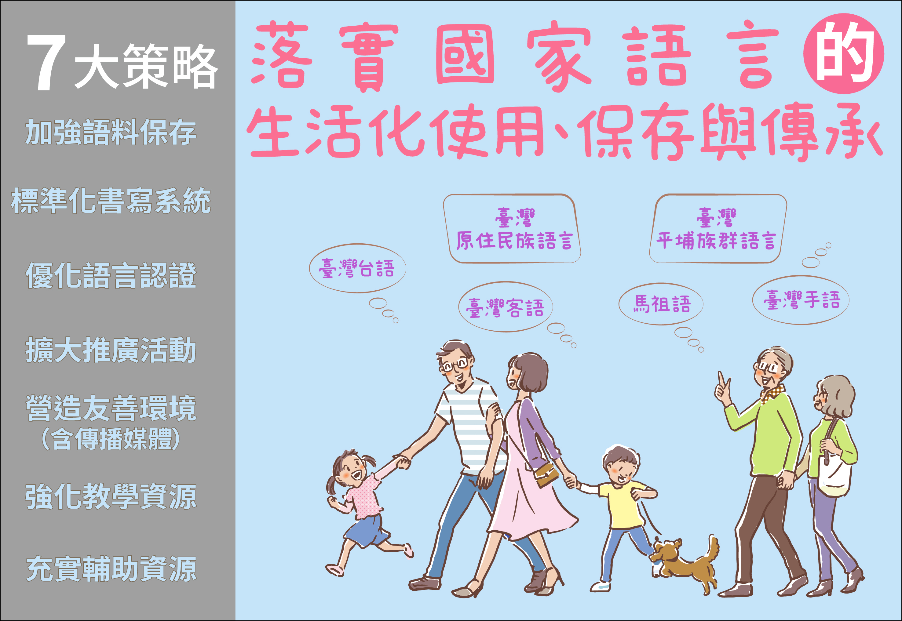 為讓這塊土地上的每一種國家語言,都能被聽、被講、甚至可以讀、寫,真正成為國人生活中的一部分,政府將持續積極努力保存、復振面臨傳承危機的國家語言,從年輕一代開始提升語言能力,承繼耆老智慧,開啟後代傳承,並能於家庭、社區、學校中,透過語言使用、學習,理解不同族群,認同在地文化,落實語言與文化平權,促進國家多元文化發展。