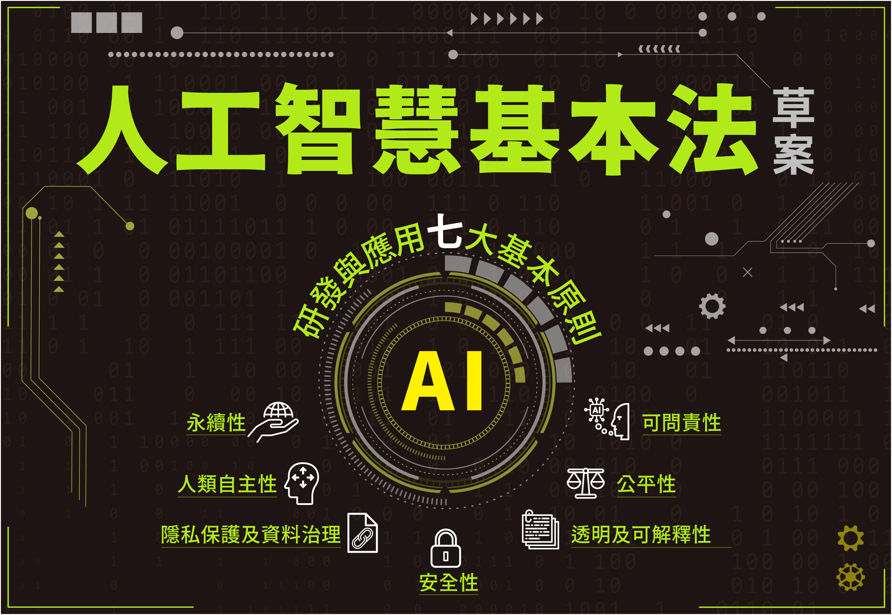 人工智慧(AI)技術近年發展快速,世界普遍認為可為整體產業與社會活動帶來廣泛之經濟及社會效益,並為我國企業及國家發展提供關鍵之競爭優勢。惟其技術雖帶來效益,卻也可能對個人或社會產生風險或影響。故為因應AI技術快速創新與隨之而來的挑戰,行政院於114年8月28日通過《人工智慧基本法》草案,以鼓勵創新為主軸,同時兼顧保障人民權益,並揭示AI研發與應用之七大基本原則(包括永續性、人類自主性、隱私保護及資料治理、安全性、透明及可解釋性、公平性、可問責性),以定錨我國AI發展方向,期在促進產業發展與風險管理間取得平衡,進而提升國家競爭力。