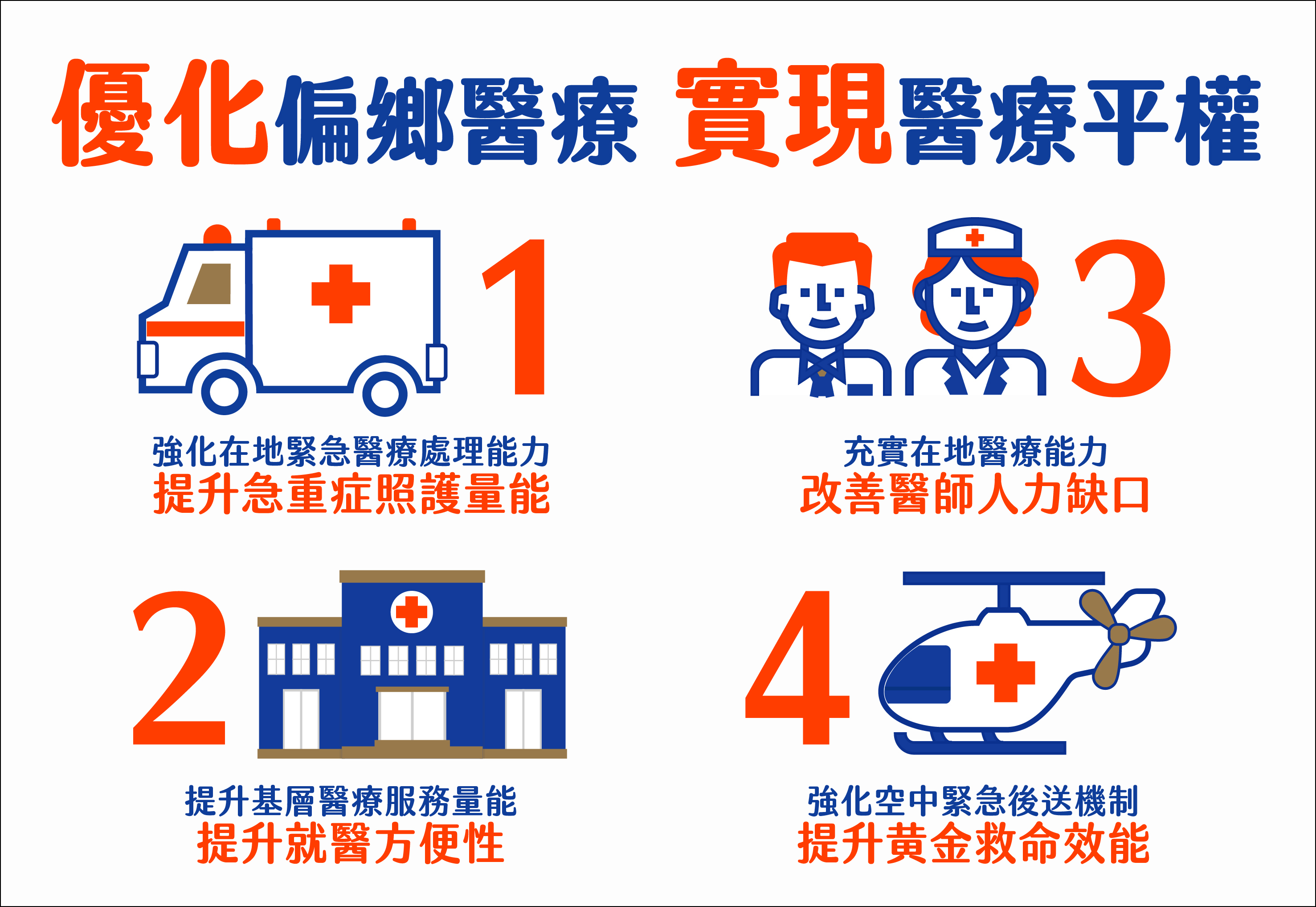 為使偏鄉離島居民均能獲得完善的醫療與照顧,政府將在現有的醫療照護基礎上,持續完備偏鄉醫療照護、充實人力資源,提供方便的就醫服務,同時強化向前延伸的健康促進與預防照護,以及向後的長照整合服務,並發展因地制宜的偏鄉照護,讓全國居民健康沒距離。