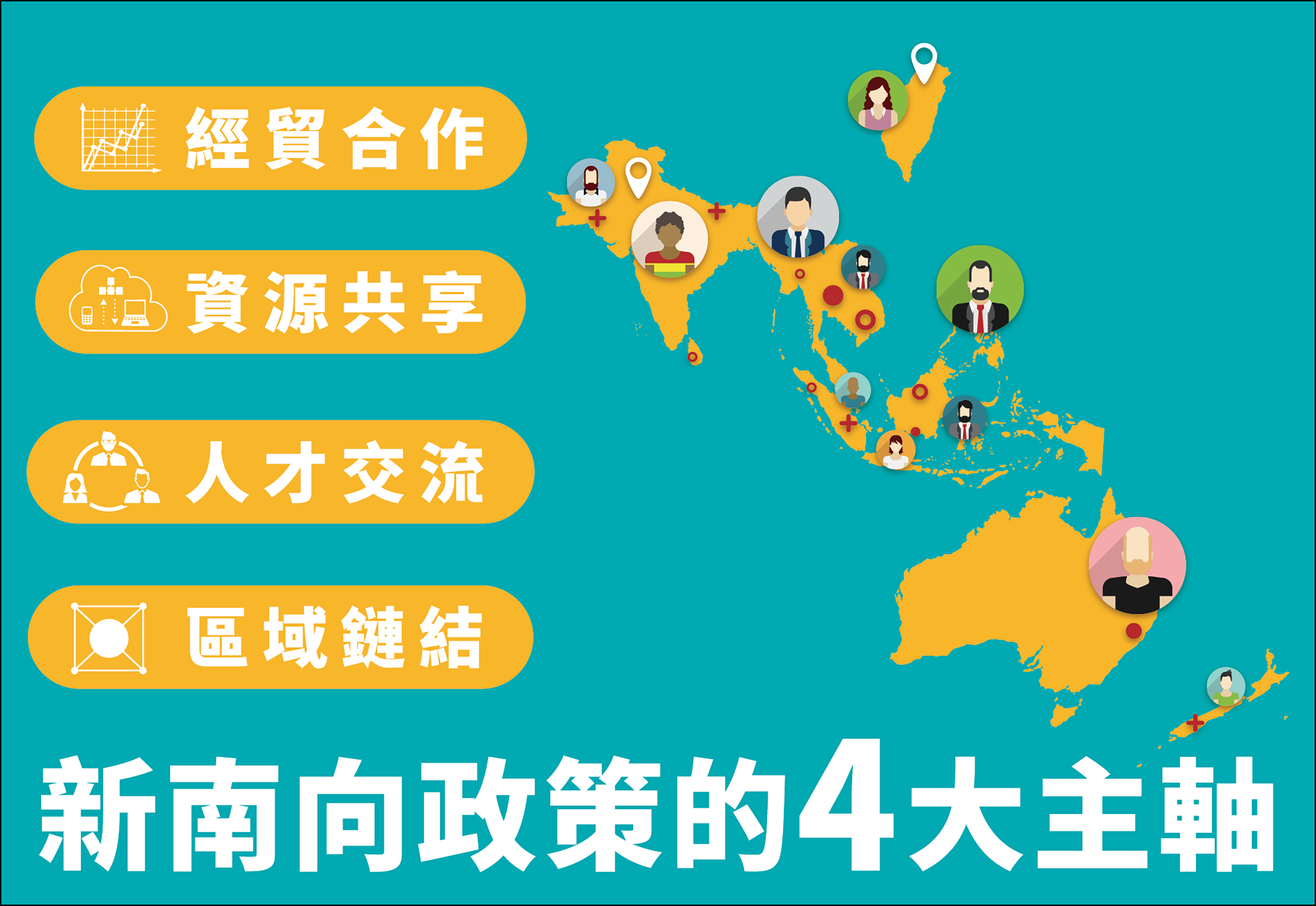 為全方位發展與新南向國家的關係,行政院於105年9月5日提出「新南向政策推動計畫」,以經貿合作、人才交流、資源共享、區域鏈結為4大主軸,期望與東協、南亞及紐澳等18個國家,創造互利共贏的新合作模式,同時整備國家能量以參與區域經濟融合。