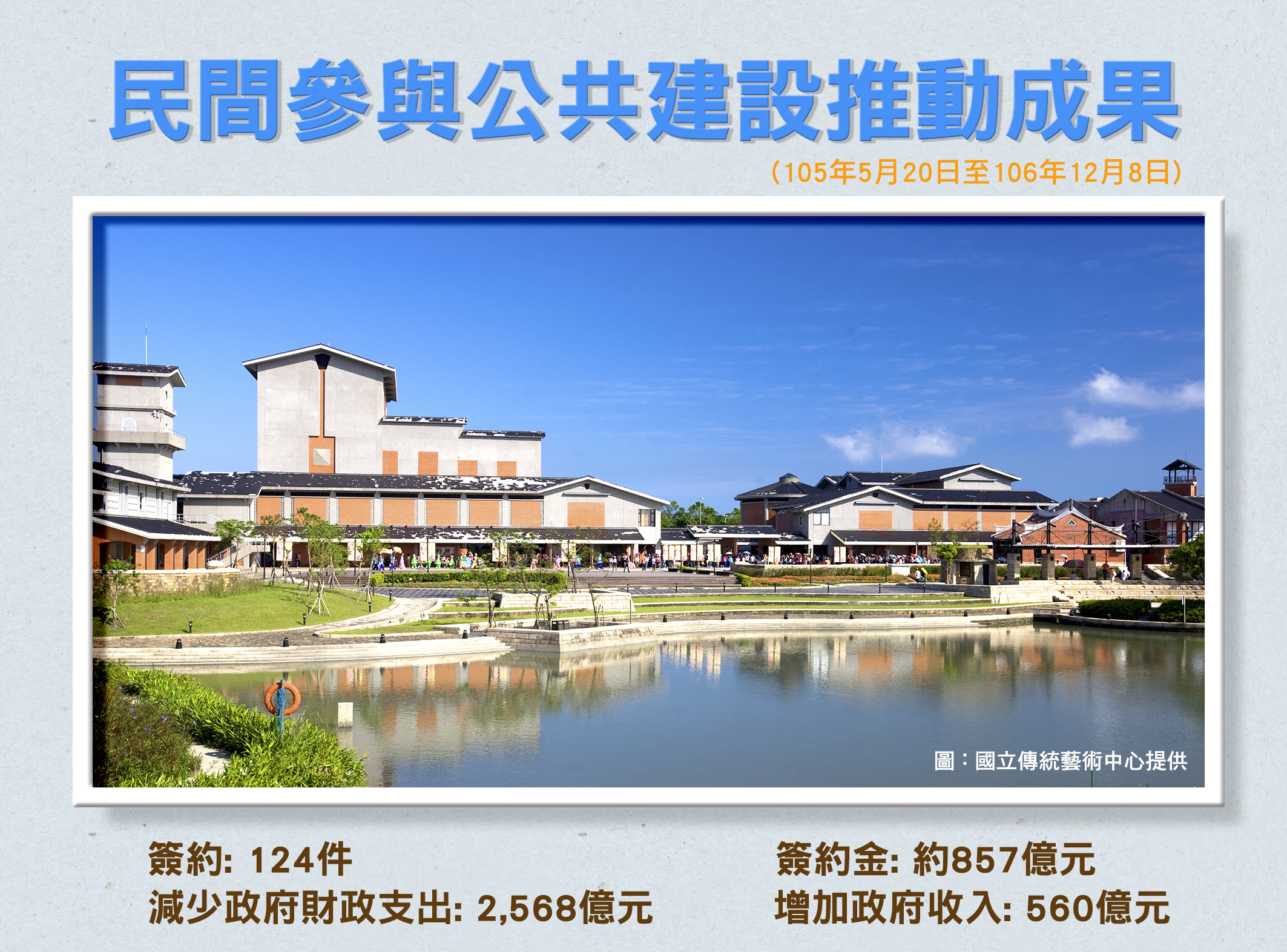 政府資源有限,公共建設及服務不能中斷,運用公私部門協力(Public-Private-Partnership,PPP)模式結合政府與民間資源合作推動基礎建設,已成為國際趨勢,是世界各國積極採用的策略。我國自89 年公布施行《促進民間參與公共建設法》(下稱促參法),建構法制基礎及推動環境,自91年至106年12月8日,民間參與公共建設簽約共1,532件、簽約金額約新台幣(下同)1.26兆元,契約期間約減少政府財政支出1.5兆元,增加政府收入7,652億元,創造就業機會逾23萬個,顯見民間參與公共建設,確實分攤政府部分公共任務,且對經濟發展有正面貢獻。