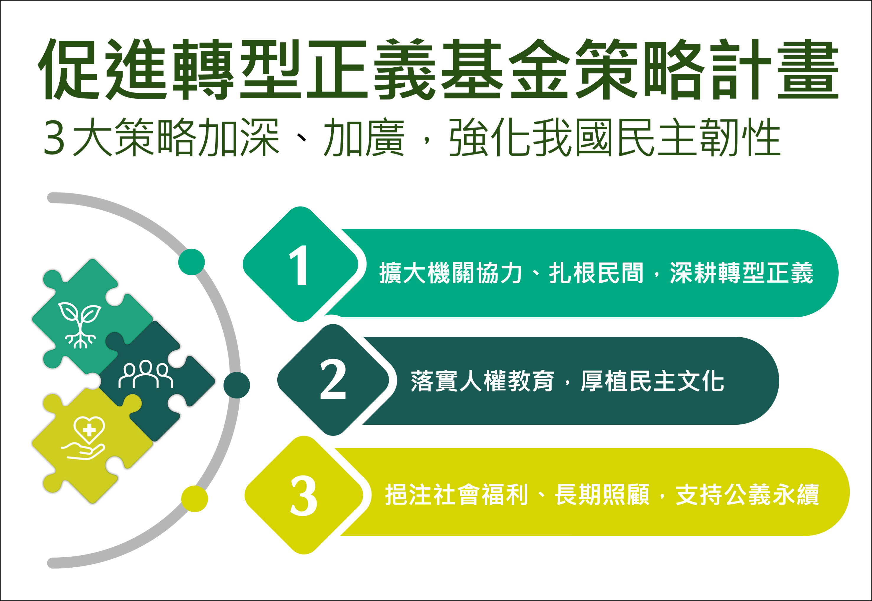 為落實「轉型正義階段政策重點策進方案」,行政院推動轉型正義會報第6次會議,決議通過「促進轉型正義基金策略計畫」,於114年8月22日函頒,作為本基金之上位政策計畫。此計畫係以三大策略,導引各政府部門乃至民間部門積極參與本基金之運用,建構公私協力介面平台,並深耕民主基礎。