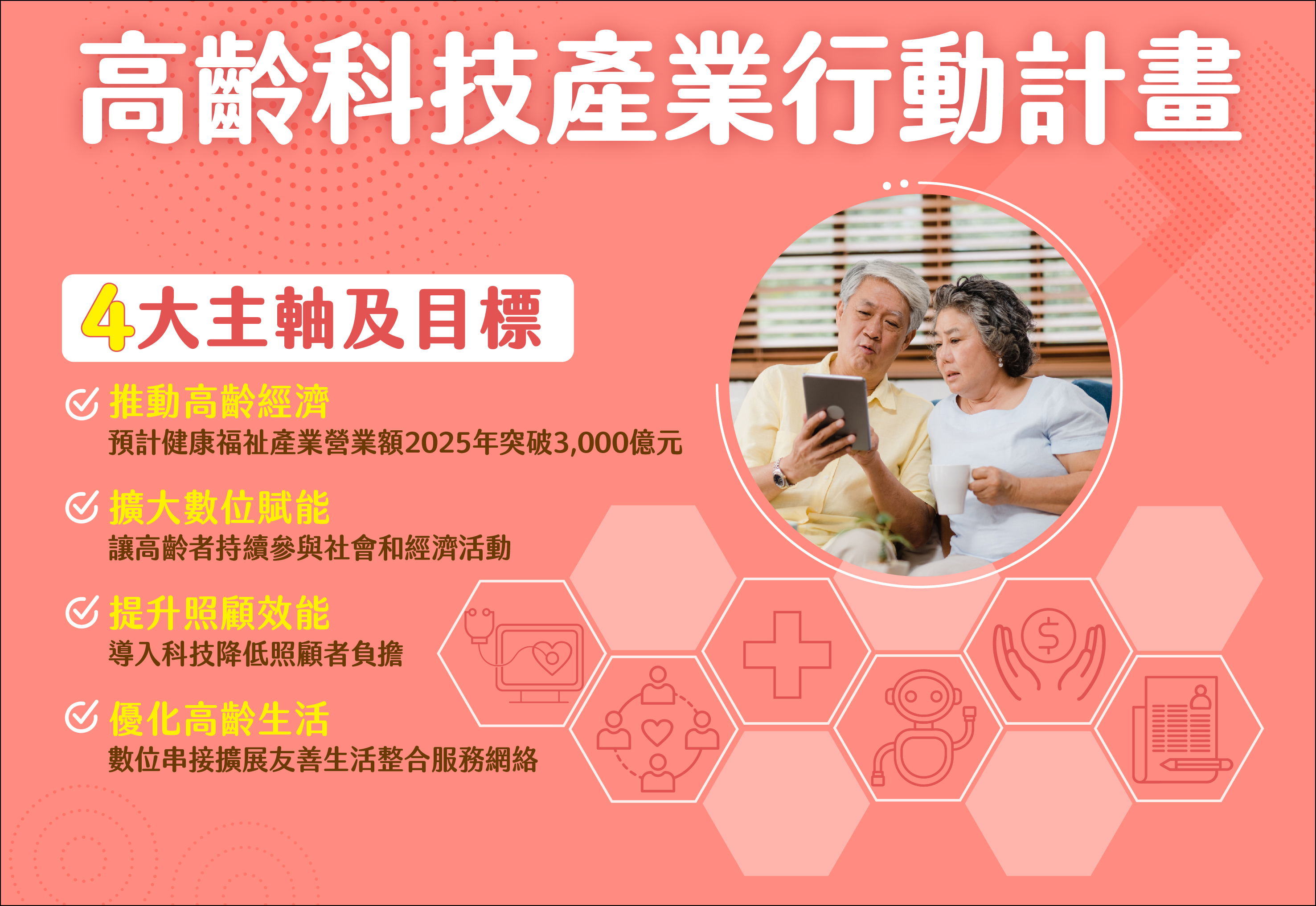 該計畫以高齡者及照顧者的需求出發,從產業發展、社會參與、智慧科技、友善生活等面向推動各項策略措施,使高齡科技產品及服務落地,提供健康樂齡及高齡族群健康促進、醫療照護、社會互動、數位學習等多元產品。