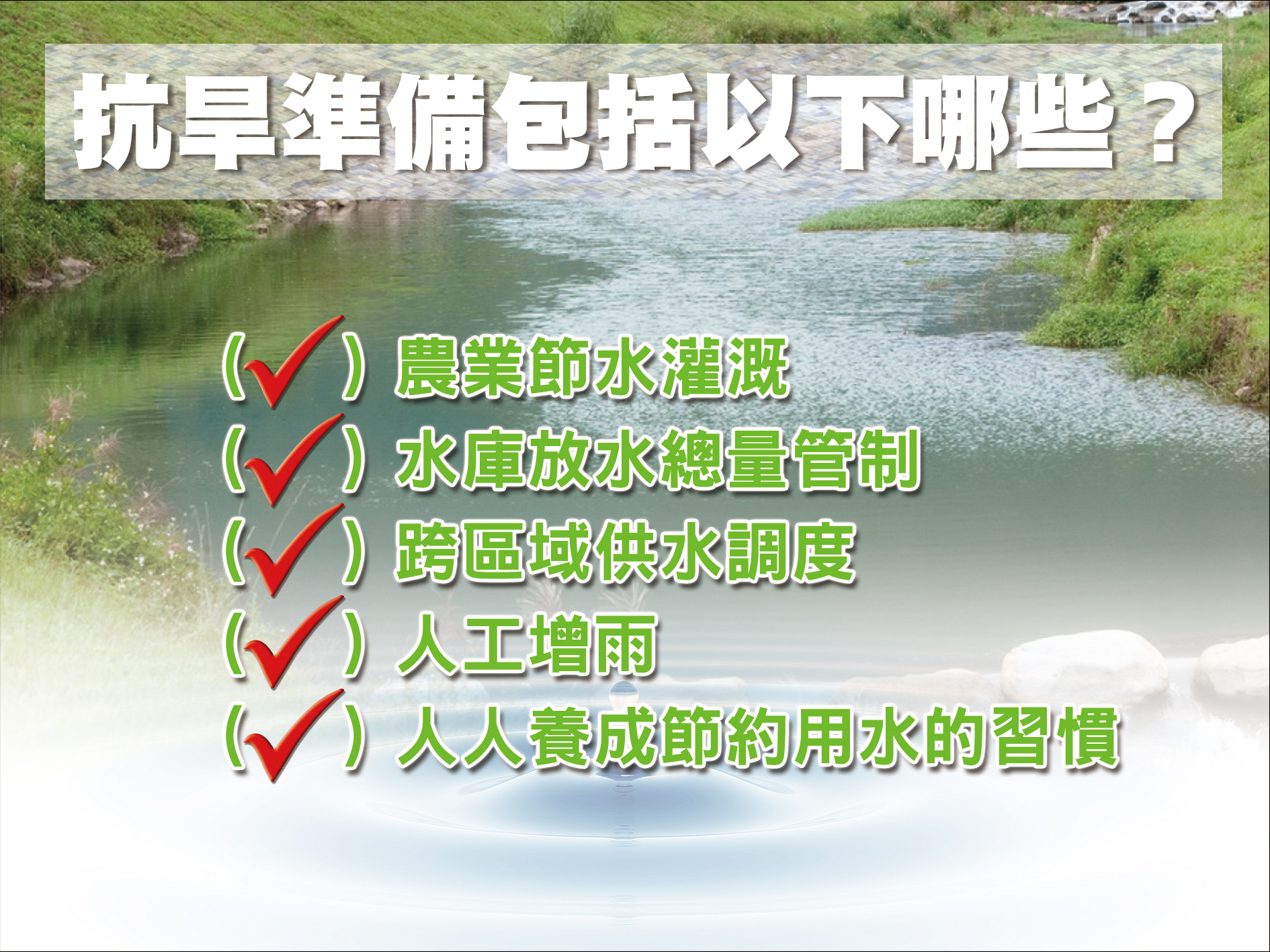 (三) 整備抗旱:強化防火宣導及消防水源及抗旱井、埤塘之整備;加強民生基本維生、緊急醫療、防疫等用水準備。