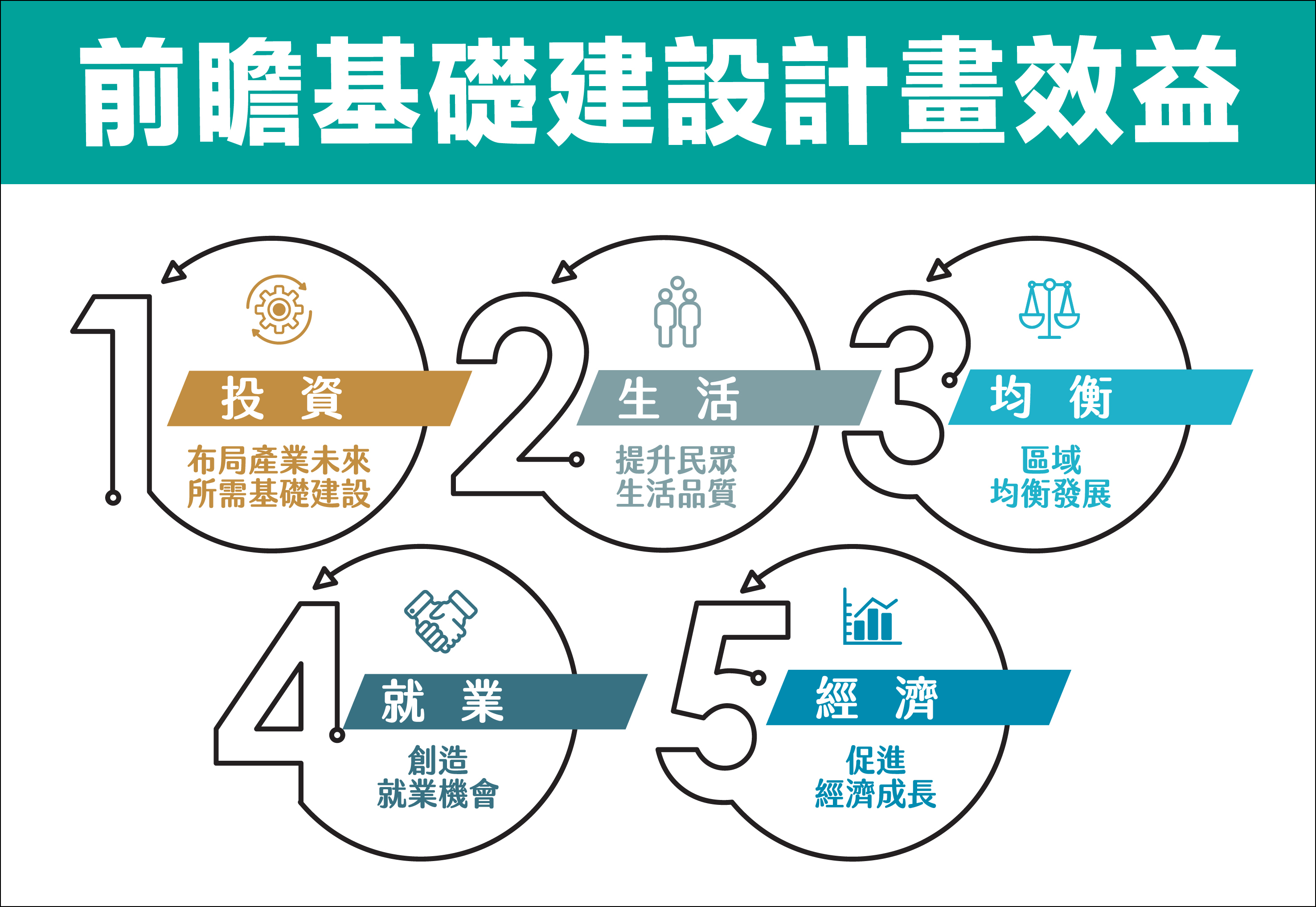 為振興經濟、帶動整體經濟動能,並因應國內外新產業、新技術及新生活趨勢,政府自106年起積極推動「前瞻基礎建設計畫」(下稱前瞻計畫),包含促進環境永續的「綠能建設」、營造智慧國土的「數位建設」、因應氣候變遷的「水環境建設」、建構安全便捷的「軌道建設」、加強區域均衡的「城鄉建設」、「因應少子化友善育兒空間建設」、「食品安全建設」和「人才培育促進就業建設」等8項建設,迄今已編列第1至4期(106年9月至113年12月)特別預算合計約7,698億元。