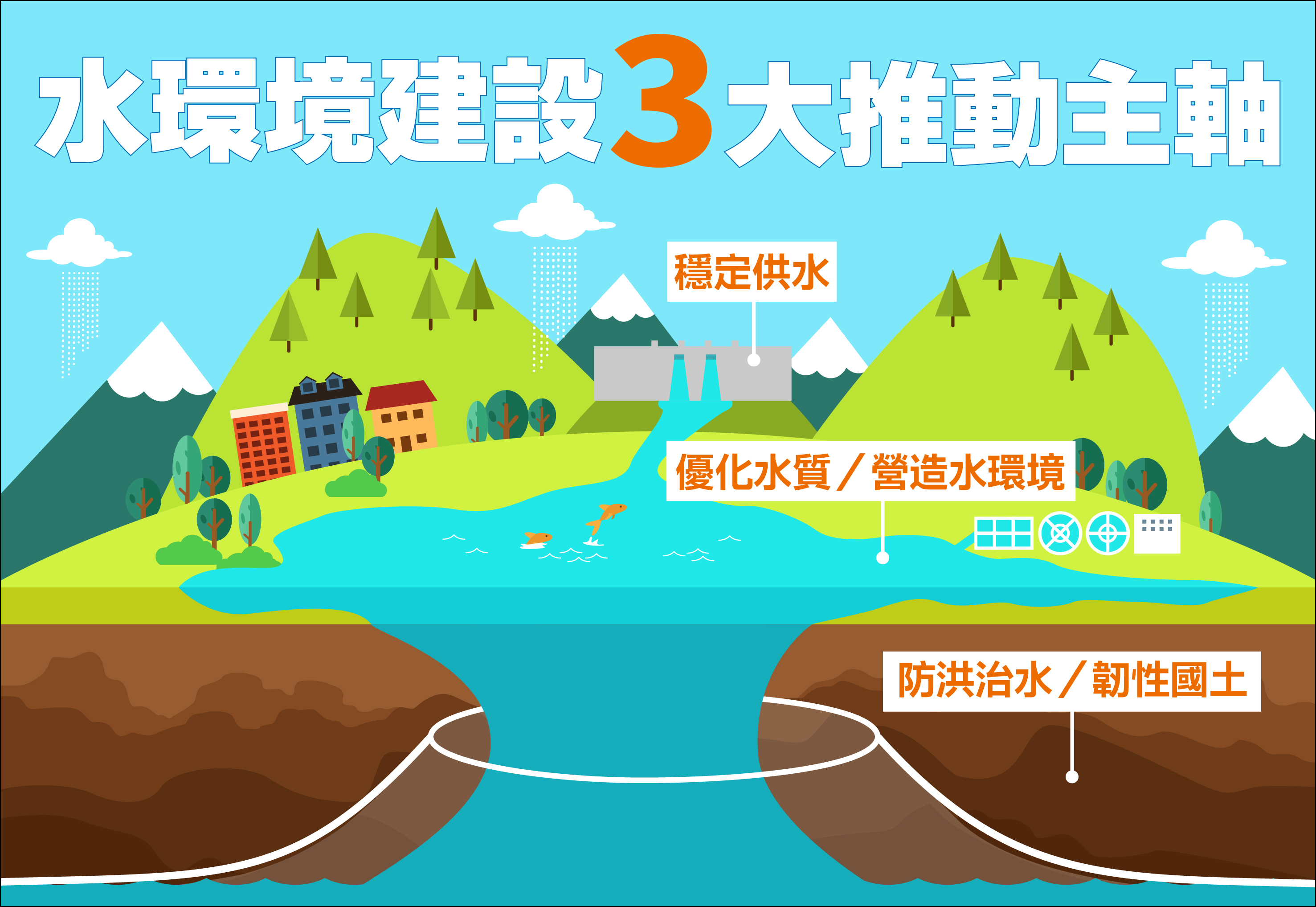 臺灣雖雨水豐沛,但因有難以留住降雨的地理侷限性,再加上極端天氣愈來愈激烈且頻繁,更將面臨缺水危機。為因應氣候變遷,兼顧防洪、水資源及水環境等需求,政府推動「水環境建設」(106年9月-114年8月),期透過跨部會資源整合,結合治水、淨水、親水新環境與節水循環新產業等措施,打造穩定供水、減少淹水、創造美好水岸空間之優質水環境。