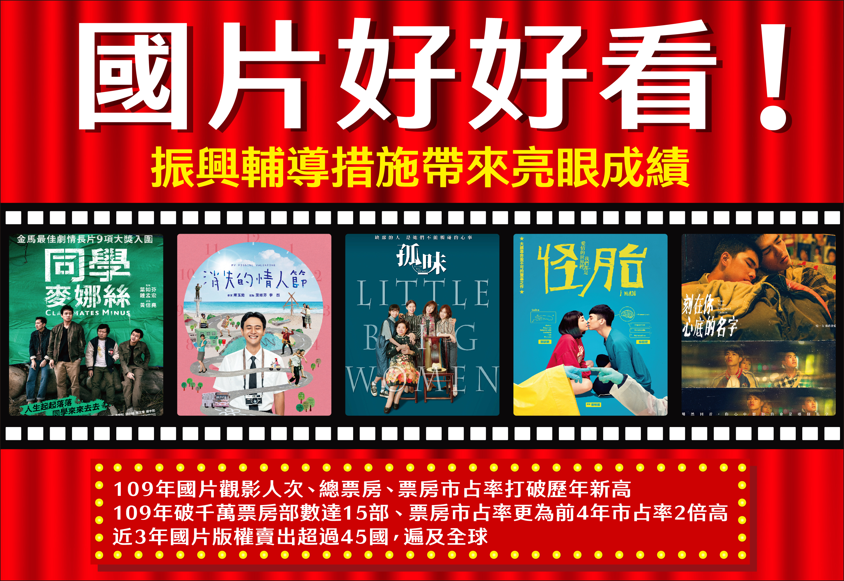 另因應此次國際疫情對電影產業衝擊,政府更啟動各項紓困及振興措施,如文化部配合行政院「三倍券」推出的「藝FUN券」,以及協助多家電影業者集結成立「國片起飛大聯盟」,藉由合作行銷活動,促進電影消費回溫,使109年國片觀影人次、總票房、國片票房市占率,衝出亮眼成績。