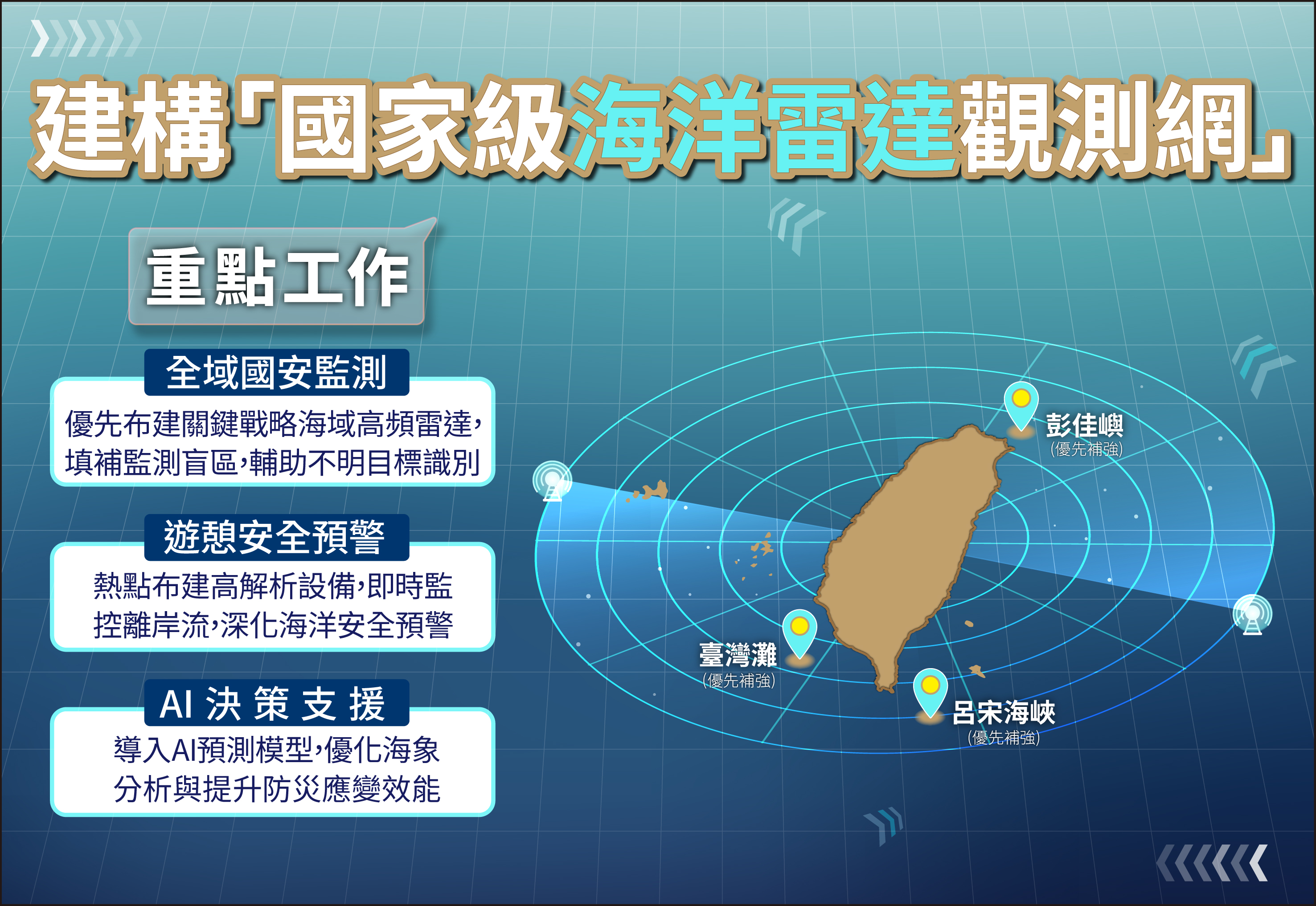 2. 補強戰略盲區:優先於「臺灣灘」、「呂宋海峽」及「彭佳嶼」等關鍵海域增設高頻雷達,輔助提升對不明目標識別,強化國安韌性。