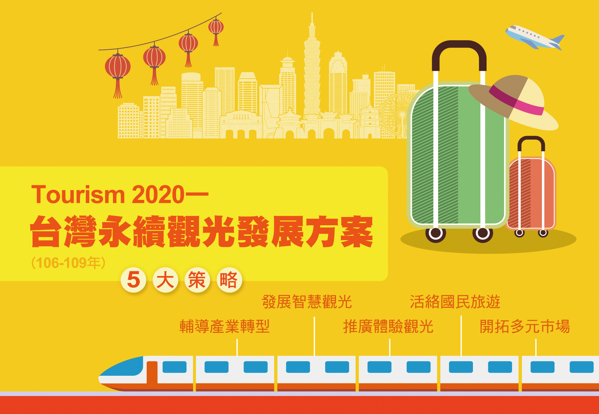 衡酌我國觀光面臨全球化、數位化、在地化等趨勢,面對來台客源市場結構盤整、區域旅遊競爭激烈及產業關鍵轉型等挑戰,行政院於107年1月核定「Tourism 2020—台灣永續觀光發展方案(106-109年)」,期透過「開拓多元市場、活絡國民旅遊、輔導產業轉型、發展智慧觀光及推廣體驗觀光」5大策略,持續厚植國民旅遊基礎及開拓國際市場。