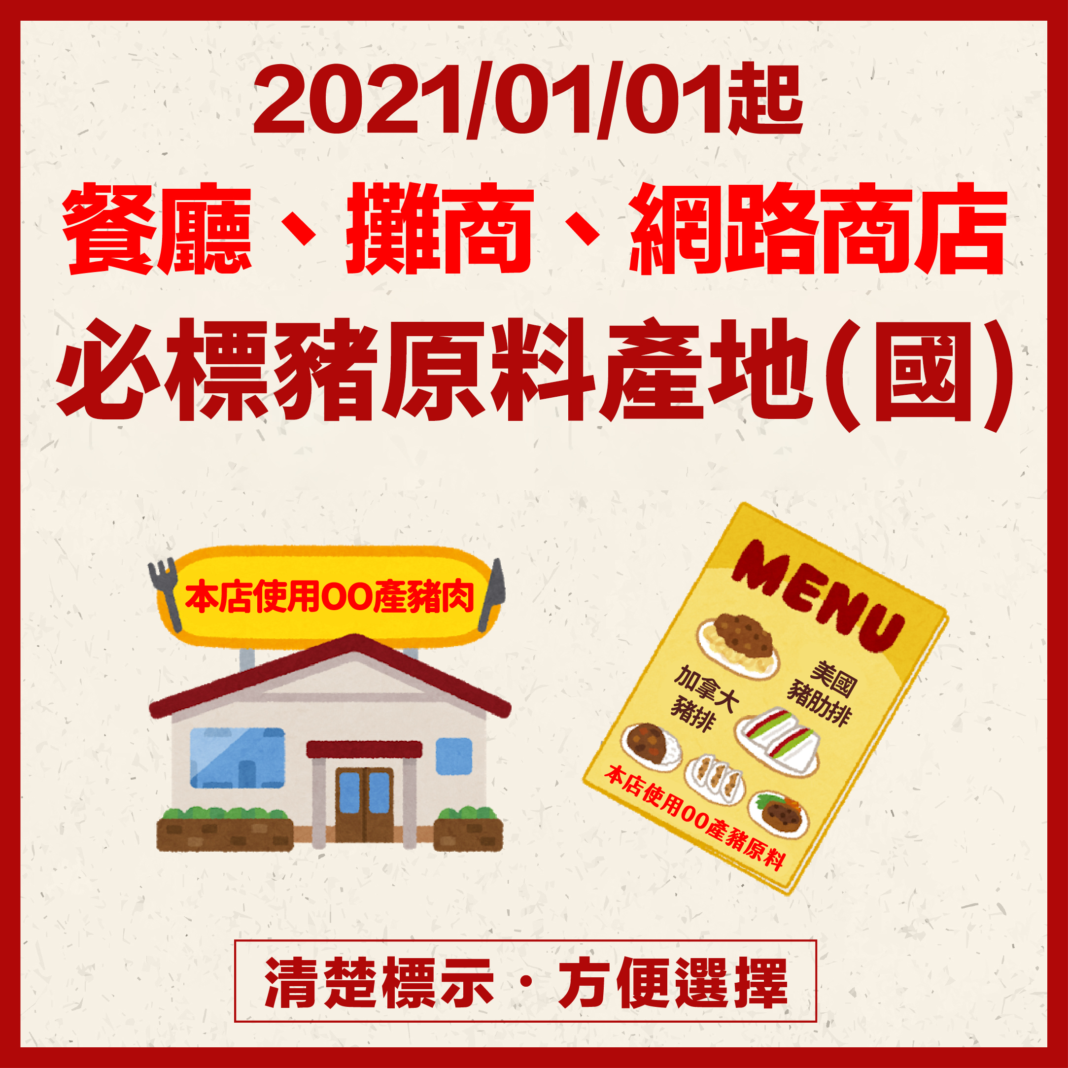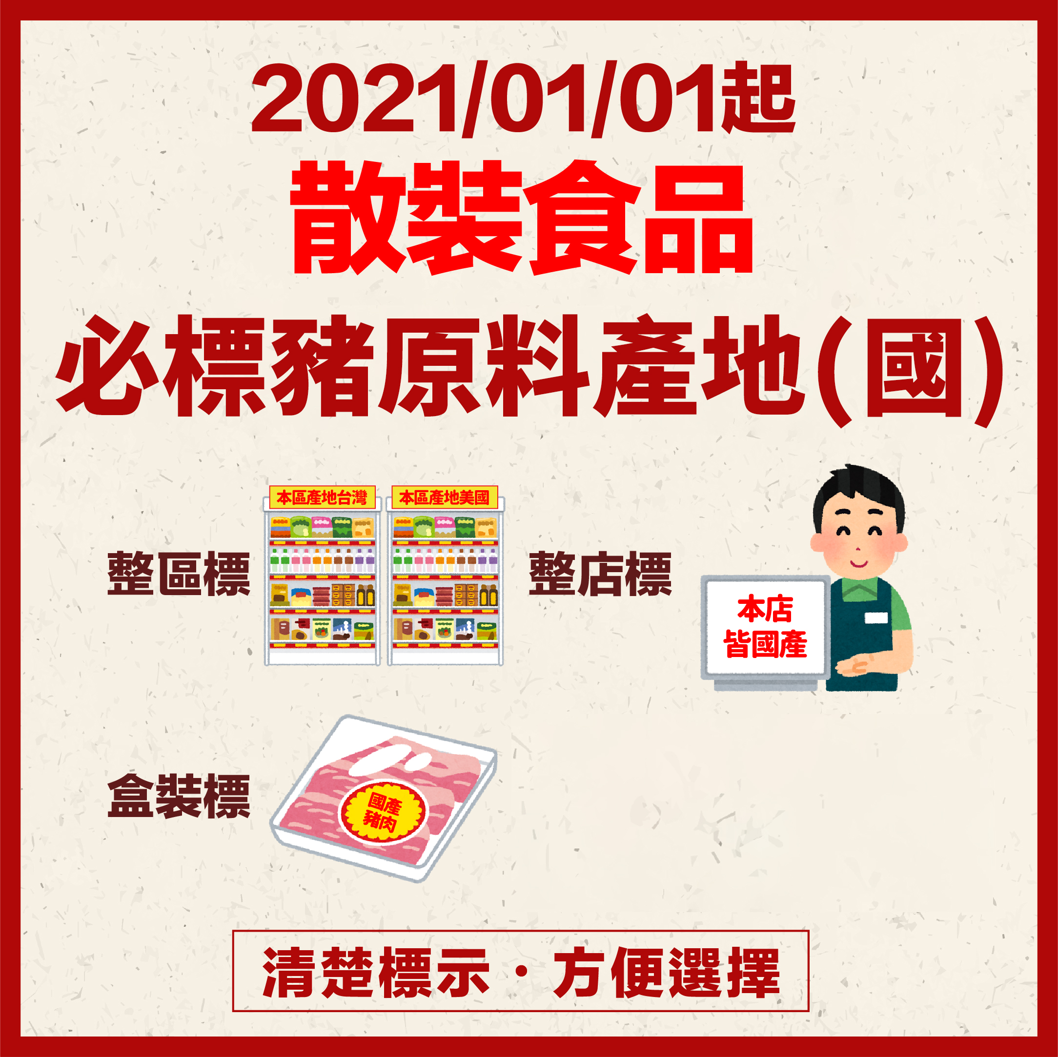> 清楚標示:針對使用豬肉之食品業者,包含輸入、製造加工、販售及餐飲業,由上而下、都須隨貨(肉)提供「豬肉及豬可食部位原料之原產地標示貼紙」(圓形是臺灣豬肉,三角形是進口豬肉,且各產地國都有),讓消費者一目瞭然,自由選擇。