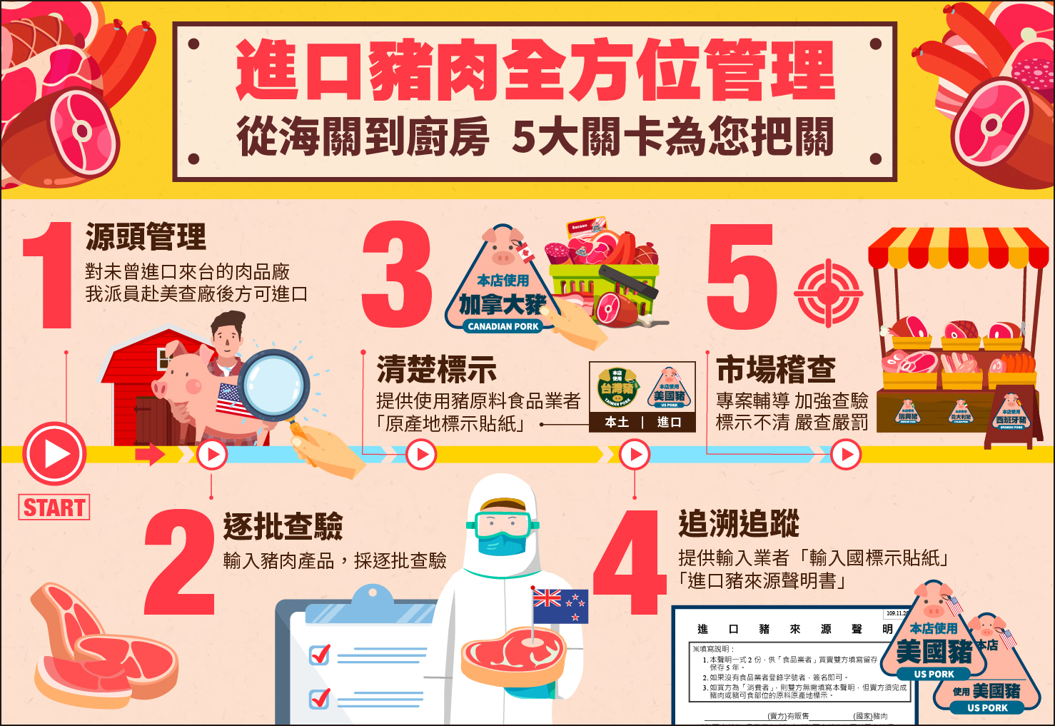 > 輸入查驗:強化邊境進口肉品查驗與檢疫,110年1月1日起,進口豬肉不分國別採逐批查驗,符合規定才能進口。