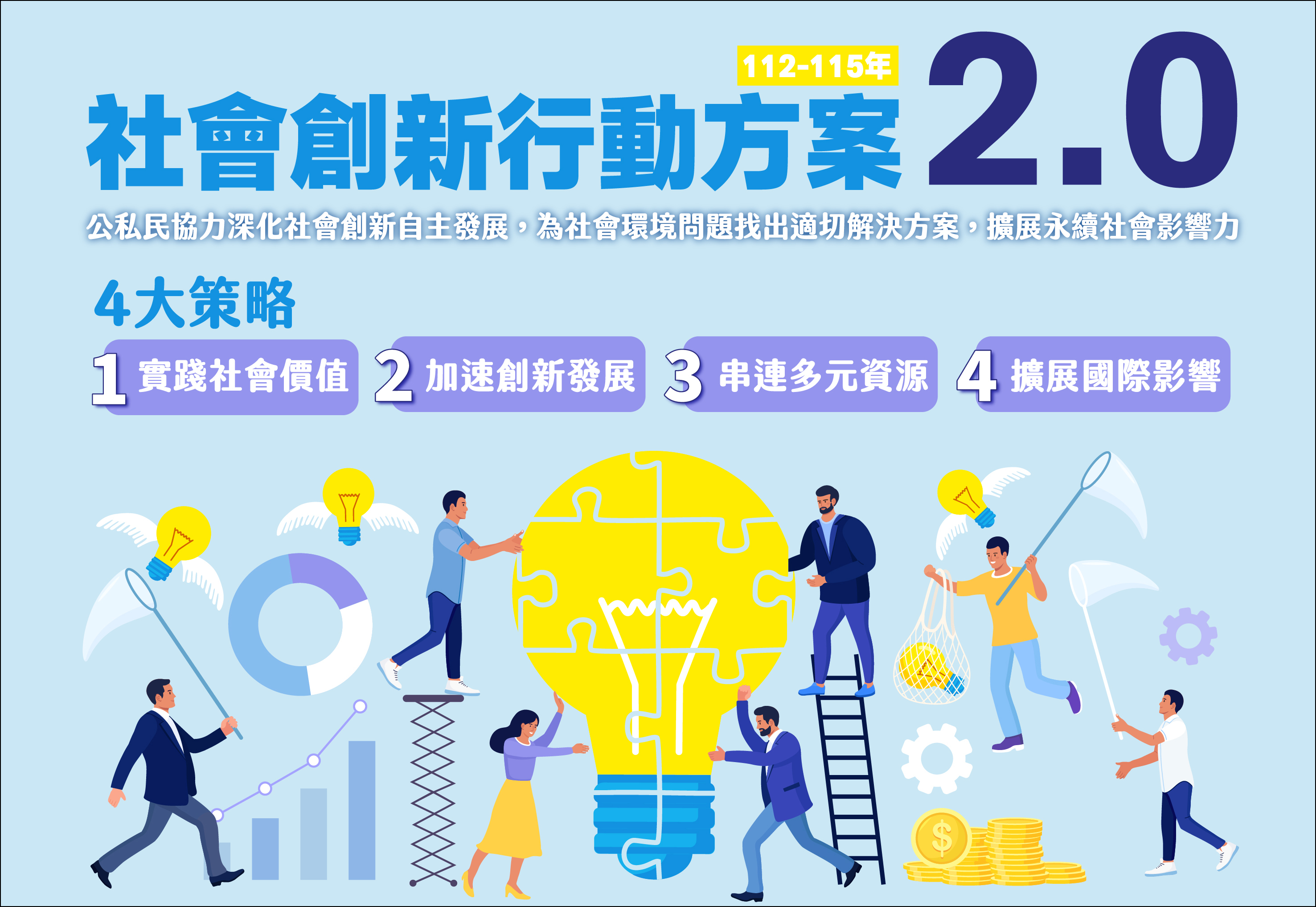 為打造友善生態系、發掘我國多元社會創新特色及模式,並扣合聯合國永續發展目標之方向,政府於107-111年推動「社會創新行動方案1.0」,至今有超過841家社會創新組織、184家支持社創的產業夥伴(包括上市櫃公司等)、帶動超過2萬人就業;社會創新產品及服務採購金額6年來累積超過新臺幣(下同)31億元。為強化公私民協力,同時因應疫後與全球氣候變遷的挑戰,政府再接續提出「社會創新行動方案2.0」,預計112-115年投入超過111億元,以4大策略為主軸,建立公私民夥伴關係,強化社會創新組織自主營運發展,為社會環境問題找出適切解決方案,擴展永續社會影響力。
