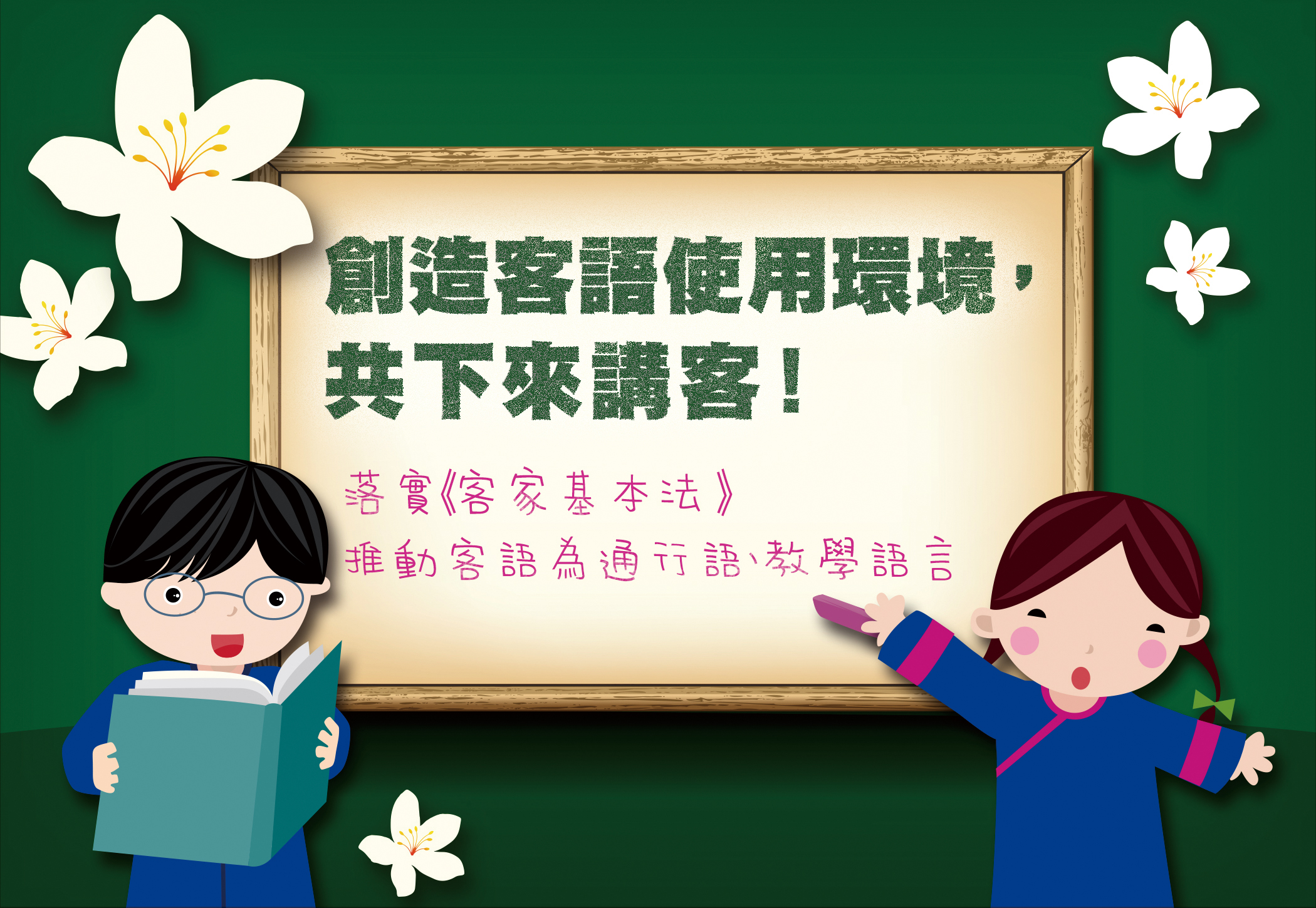 台灣是個多族群的社會,因文化多樣,造就其多元而豐富的面貌;其中的客家文化即是「文化台灣」重要元素之一。然而,近年來儘管客家人自我認同逐年提升,但客家語言流失情況仍然嚴重。鑑於客語是振興客家文化的關鍵,是客家族群生存的重要命脈,政府除積極推廣客語教育,辦理客語能力認證外,並將致力於開拓客語使用場域,營造客語友善環境,以提升客語使用率與能見度,期能使客語成為客家文化重點發展區之通行語,進而復興客家文化。