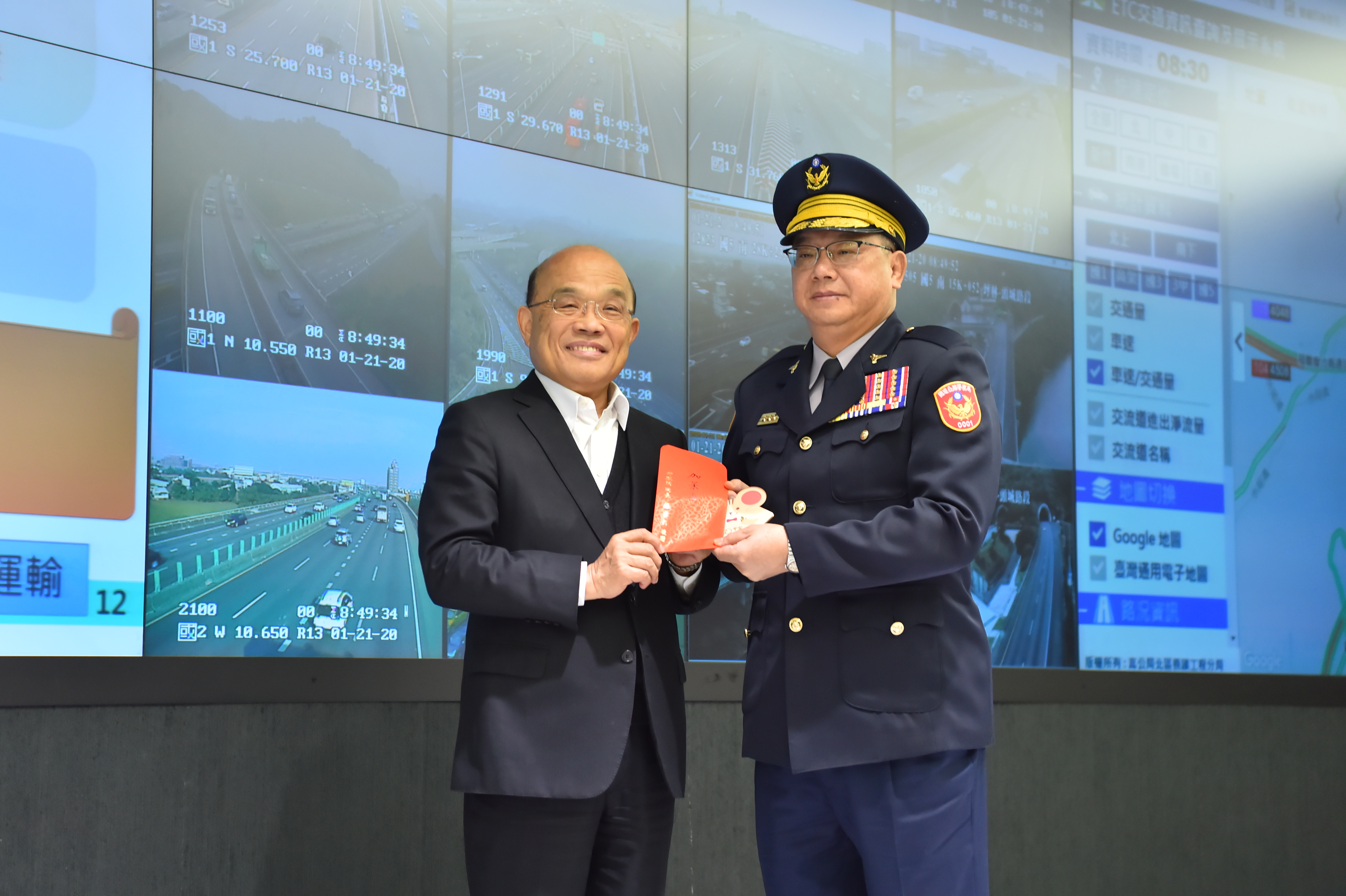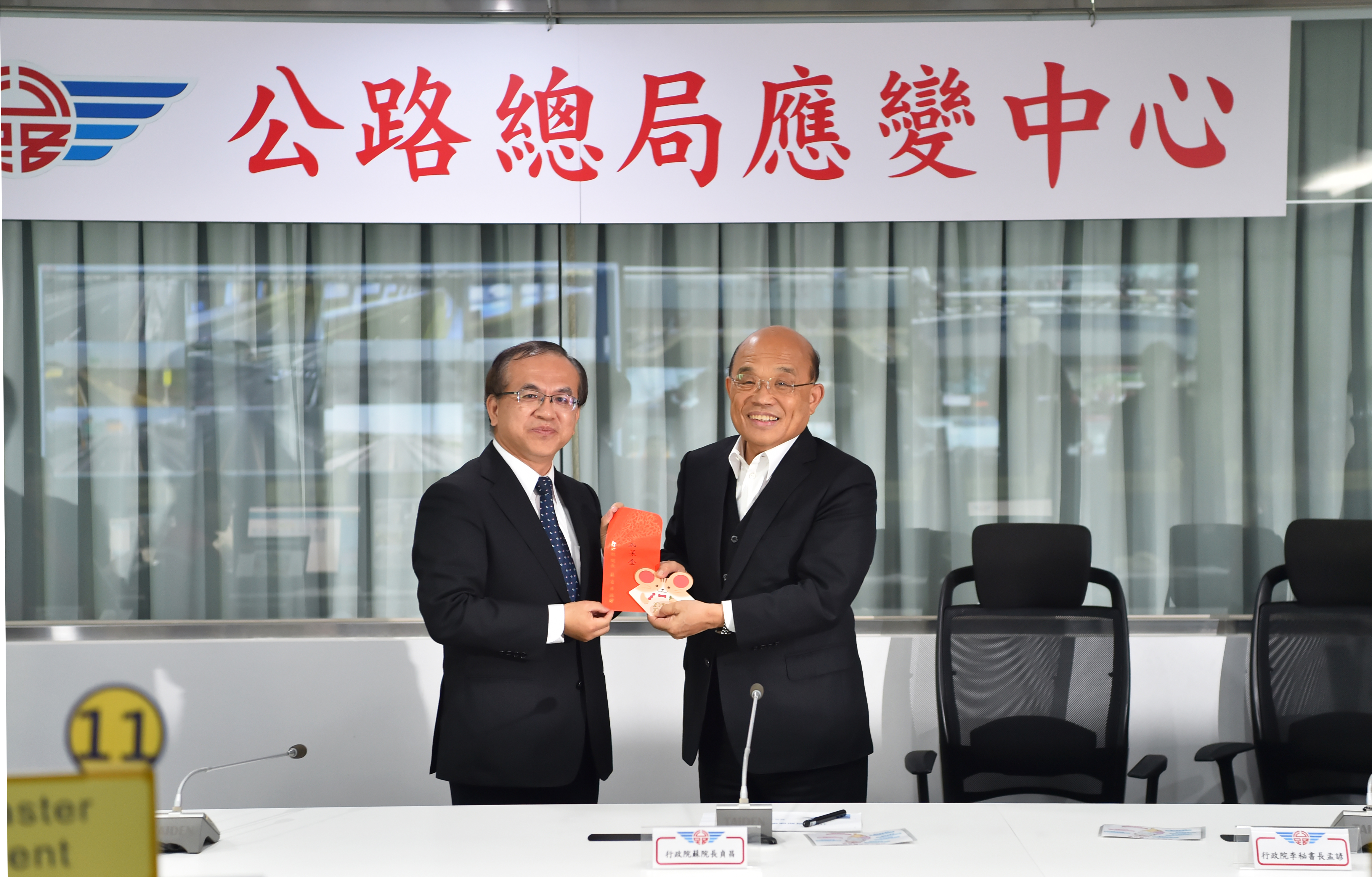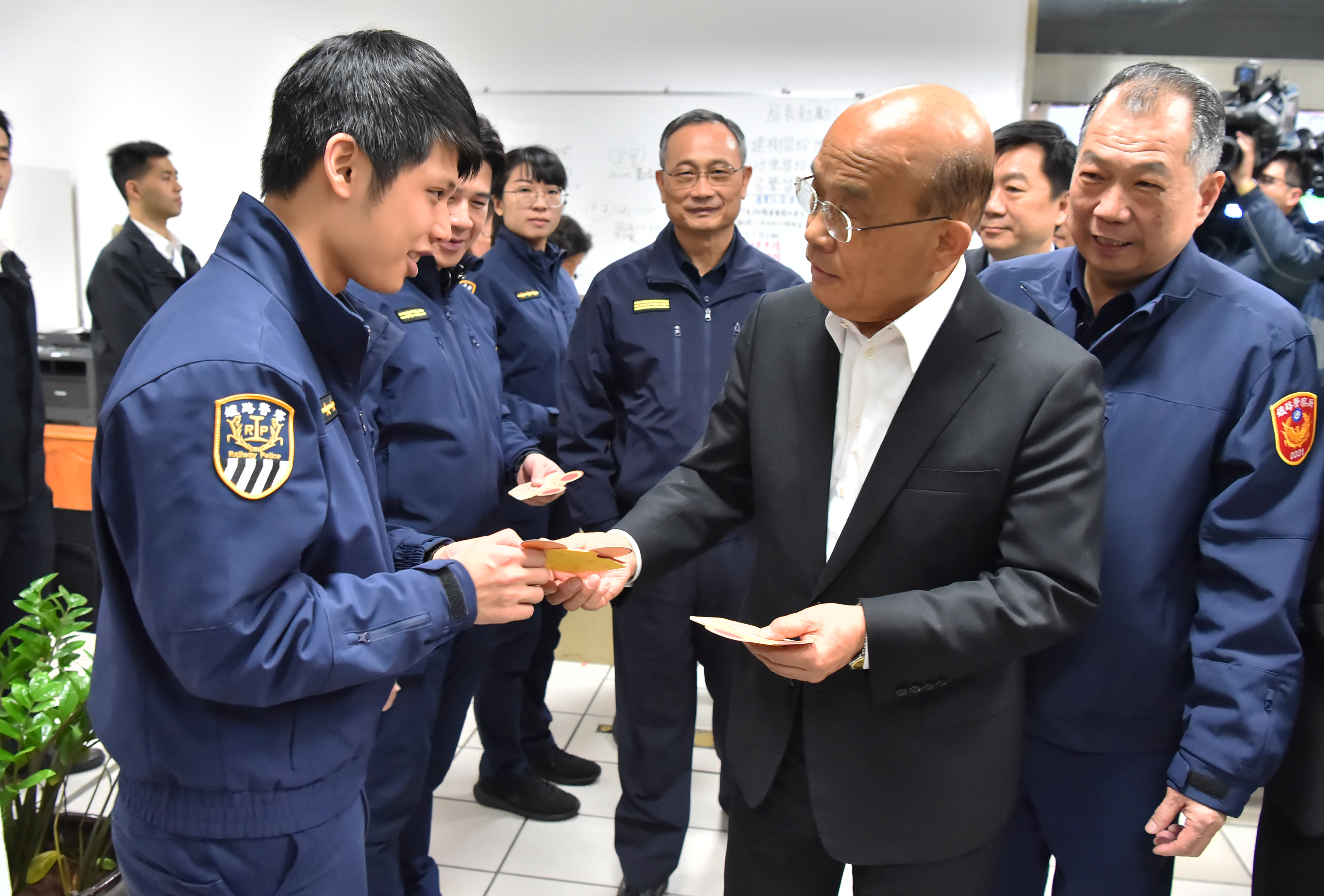 蘇院長此行至高公局交控中心、桃園國際機場、公路總局、台北車站與鐵路警察局台北分駐所,皆分別致贈加菜金與賀歲福袋,並向工作同仁與警察弟兄堅守崗位鞠躬表達肯定與感謝。院長表示,台灣最大的人口移動,隨著春節到來就要展開,希望大家把春節疏運做到最好、做到零缺點,讓所有的國人同胞都能滿意,面臨接下來的挑戰,務必戰戰兢兢,把每一個事項做好。