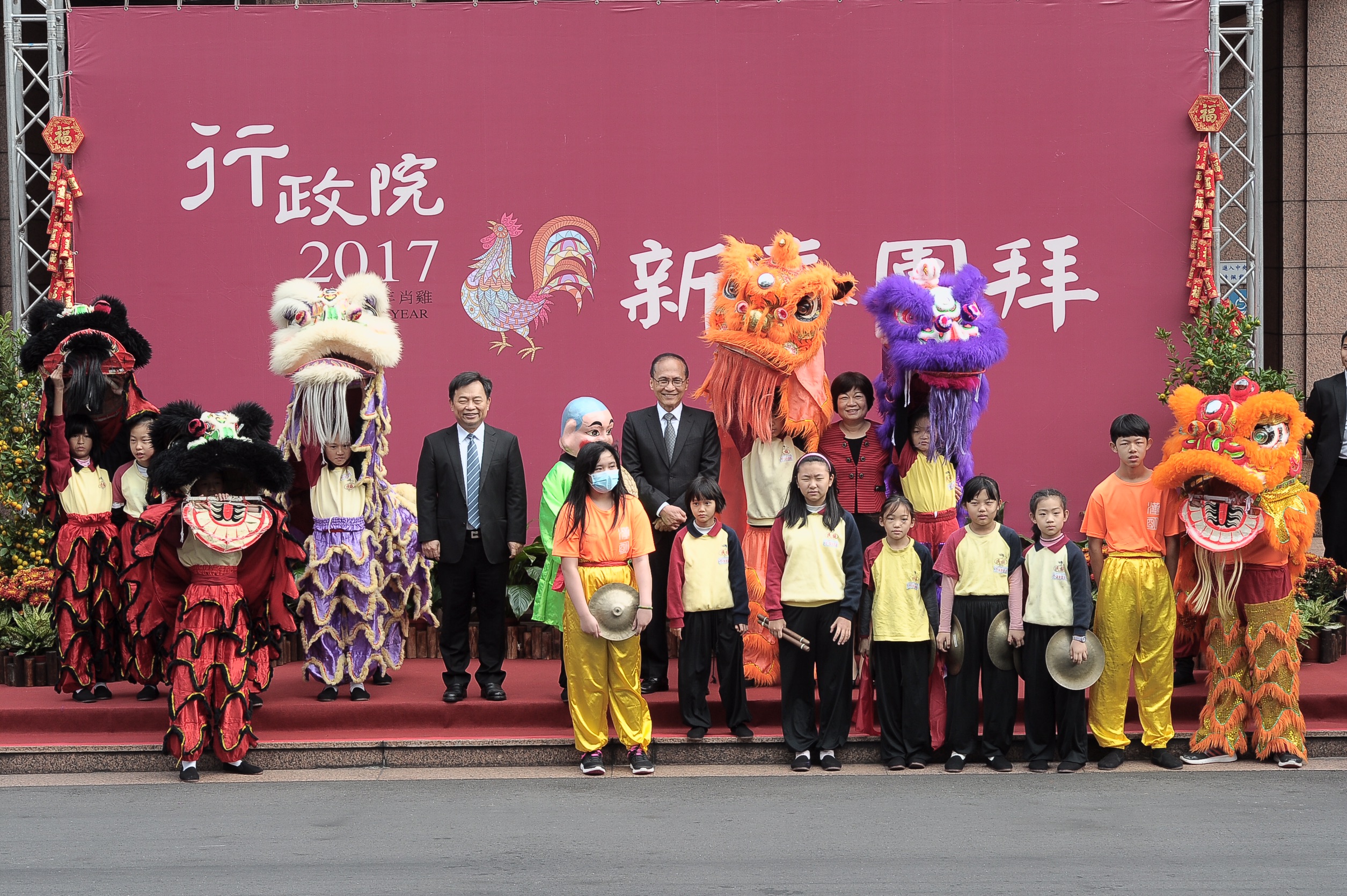 今日新春團拜在台北市立民族國小舞獅團帶來的「祥獅獻瑞迎新春」表演中熱鬧開場,小朋友精彩的演出讓林院長直呼好可愛。現場除了林院長、副院長林錫耀、秘書長陳美伶及政務委員,各部會首長也齊聚一堂,大家拱手互道新年快樂。