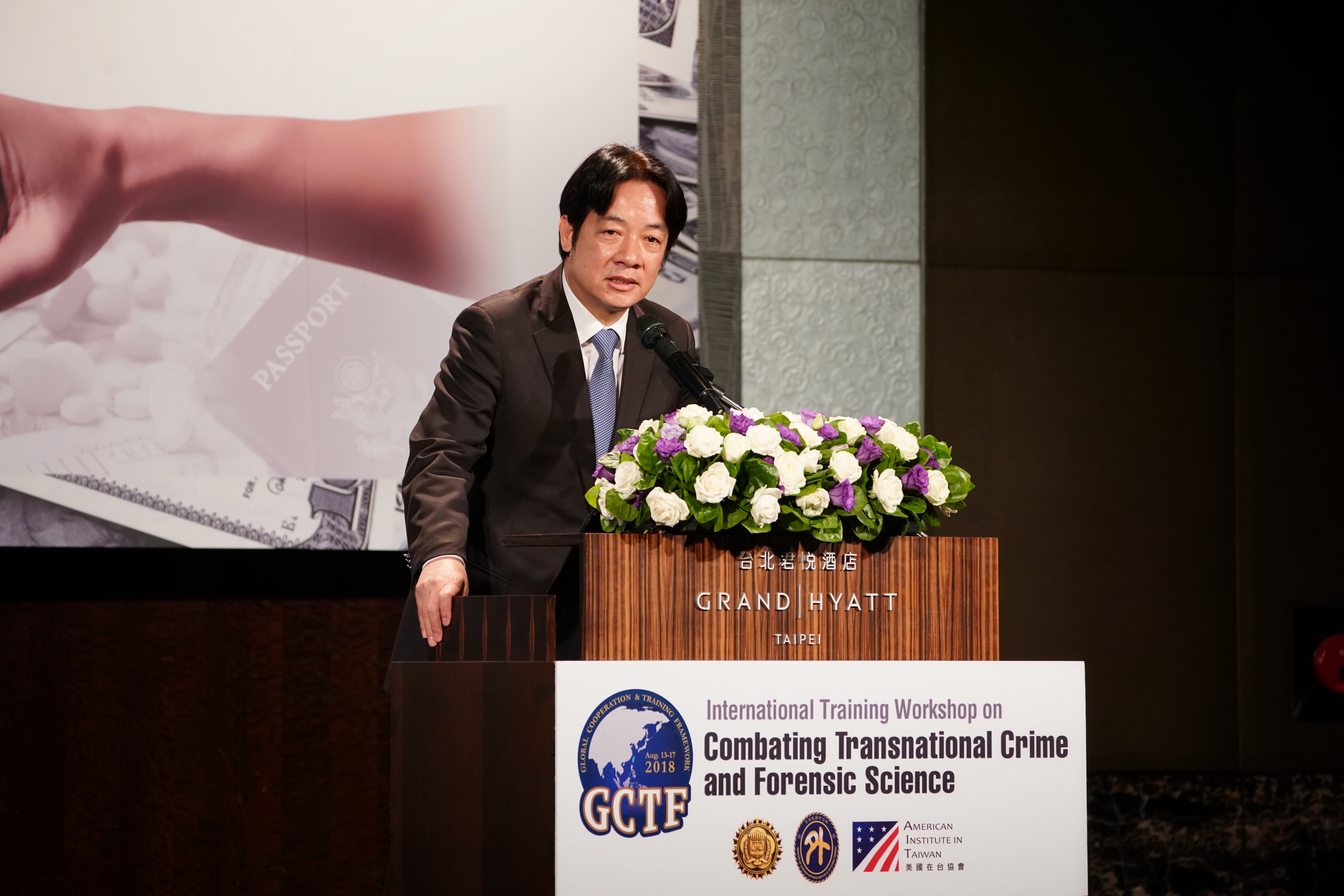 行政院長賴清德今(14)日出席「2018全球合作暨訓練架構(Global Cooperation and Training Framework, GCTF)-打擊跨境犯罪及美鈔、護照鑑識國際研習營」開幕式時表示,打擊毒品需要跨國合作,台灣在面對任何挑戰也不應逃避,努力扮演區域和平締造者與進步貢獻者的角色,善盡國際社會成員責任,積極與各國建立平等互惠的實質關係。