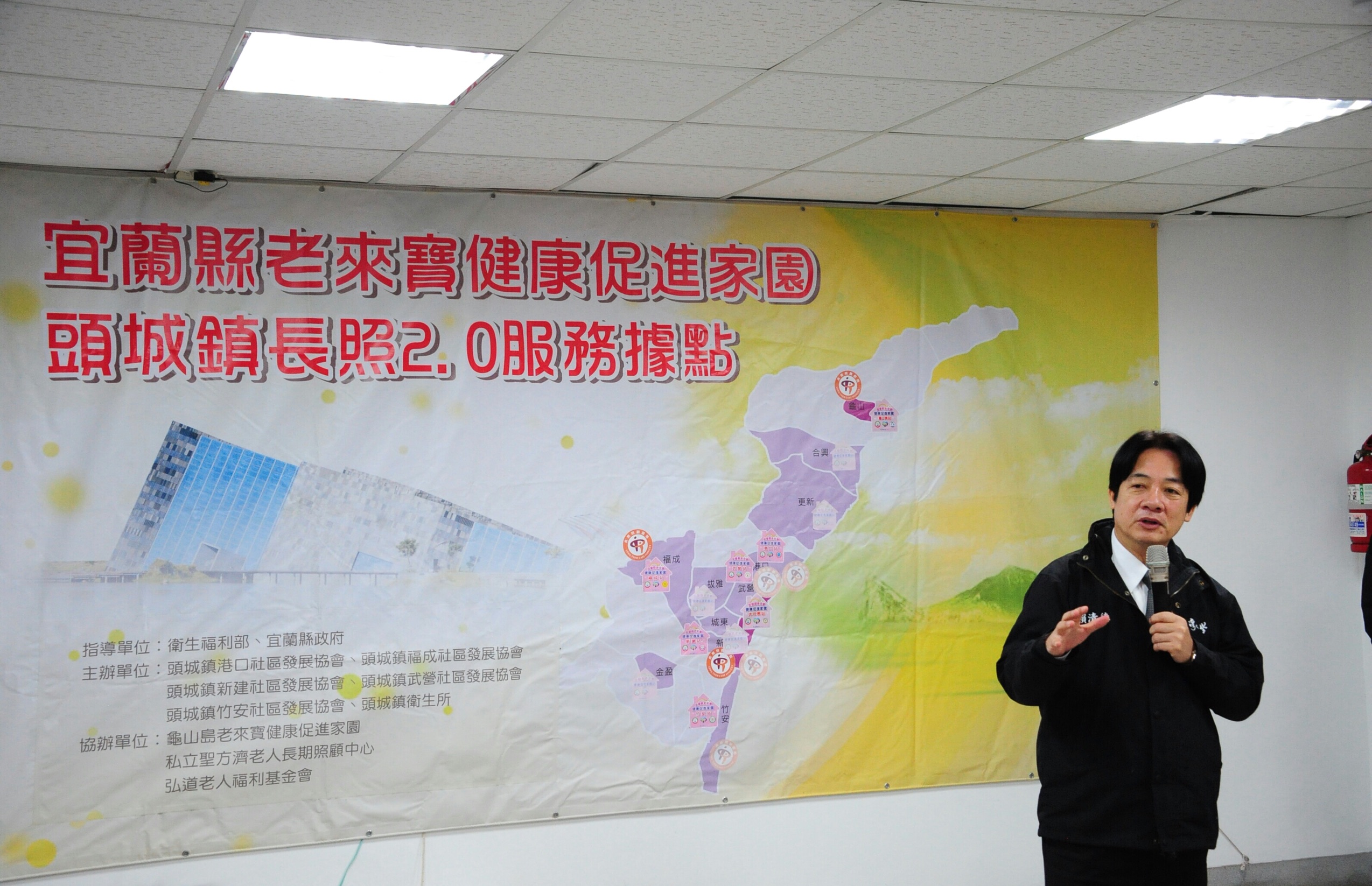 隨後,賴院長訪視頭城鎮衛生所,實地瞭解宜蘭縣「長照2.0」推動情形。賴院長表示,蔡英文總統對於我國65歲以上長者人口愈來愈多的問題非常關心,請他和衛福部長陳時中至各縣市,實地瞭解有何問題需協助解決。